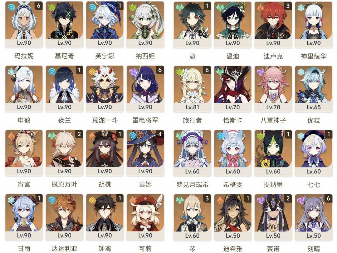 速玩⚡️33个五星角色❤️3满命玛拉妮6雷电将军6刻晴✨4莫娜✨3迪卢克3琴✨2赛诺2万叶1钟离1魈