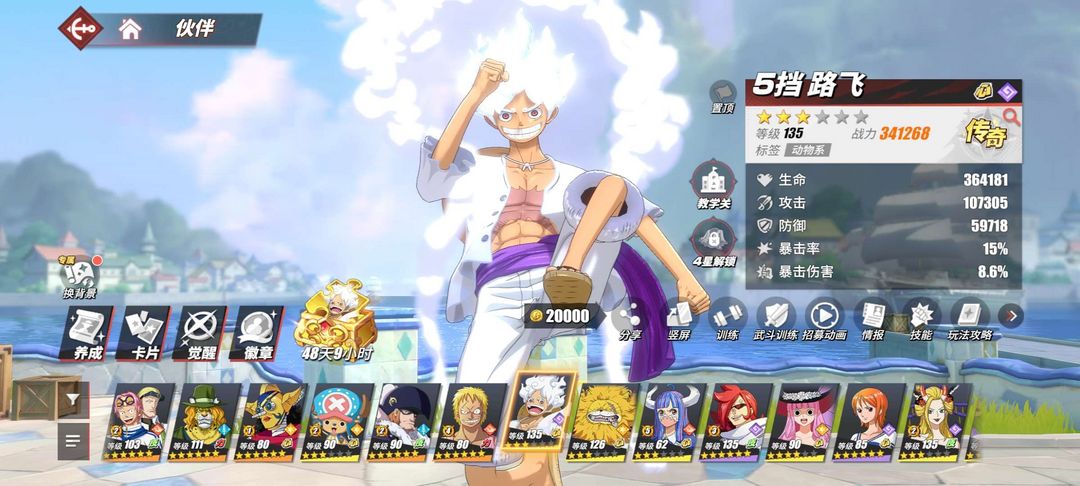 官服97%的人物,pvp玩的爽。多个人物解锁六星特效。最新尼卡路飞、桃之助将军已上线。