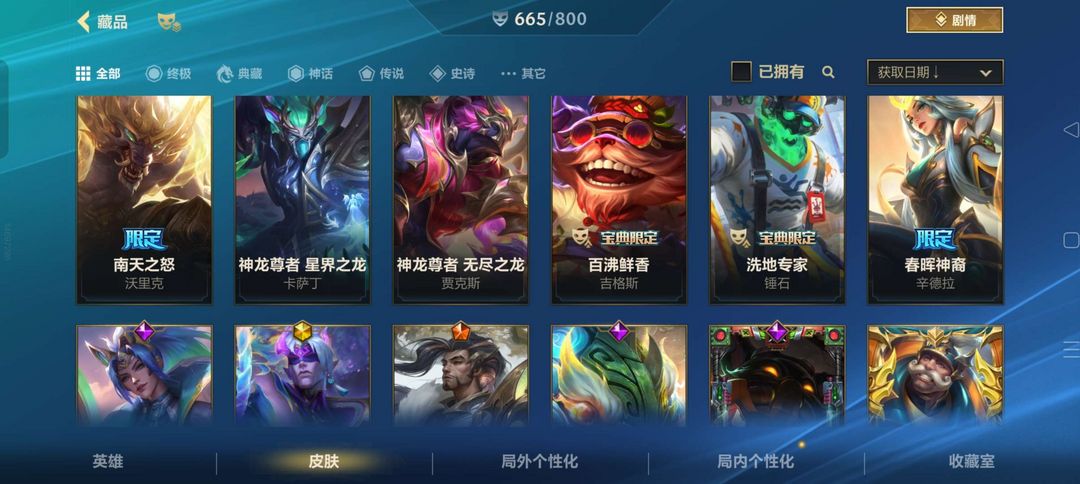 可排位 1典藏21神话 675个皮肤 动东西白嫖挂机拉黑⭐超武腕豪⭐天赋觉醒全皮⭐双城之战全皮等