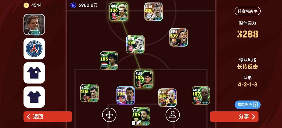 实况安卓账号可租,战力3290,最新教练卡佩罗,有msn,很多新球员,毕业阵容。长反很好用。