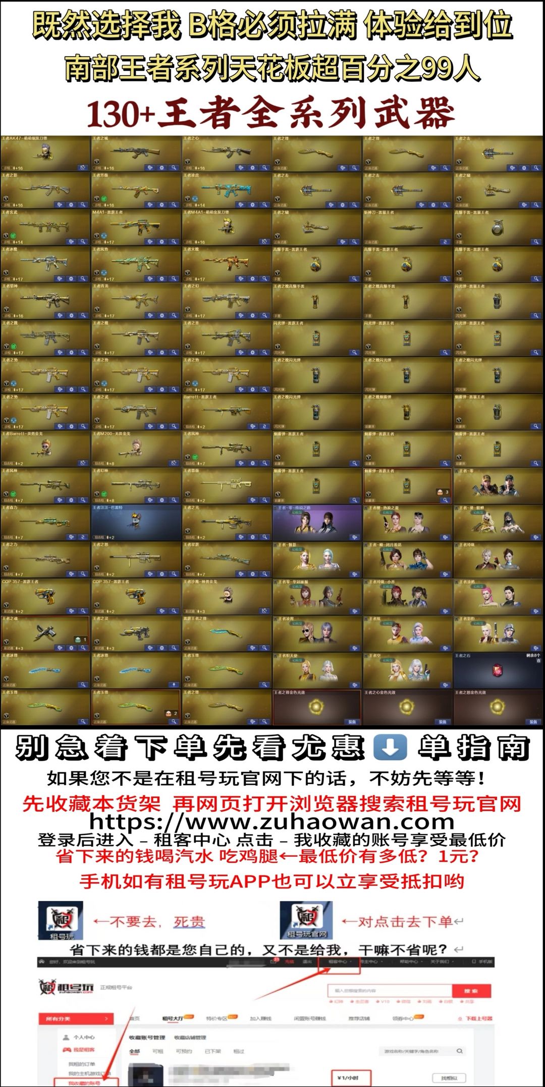 限制: 撤单率<60%才可租用此帐号装备描述:【498V 9传说 150王者 13炫金(250个角色供选择)288个皮肤 300多个玩偶 20多套人物从头到脚装扮 】【高质量英雄武器 不重复】 由于上传的容量有限,以上只是截图部分,想要更加详细可以进入游戏进行了解。 温馨提示:看清楚图片在确定下单,所有图片都是真实截图 【租完后恶意撤单直接拉黑处理哦】谢谢配合。✔ 温馨提示:如下单非密码问题撤单【一律永久拉黑】。✔ 如果遇到账号冻结上不去情况投诉撤单稍等片刻(3分钟)之内解除冻结并且上架此号。✔ 温馨提示:请大家素质文明游戏,禁止游戏内骂人,被举报禁言【一律永久拉黑】。✔ 温馨提示:该账号投入 50 万多RMB,心悦5,公安局网警都已经备案记录,每一个登录游戏IP地址都会详细记录,账号因租方开挂导致被封按充值金额十倍赔偿 【租了那就默认同意规则】✔ 希望大家玩的愉快,不要去做一些违规的事情,千万不要做一些不利己的事情!