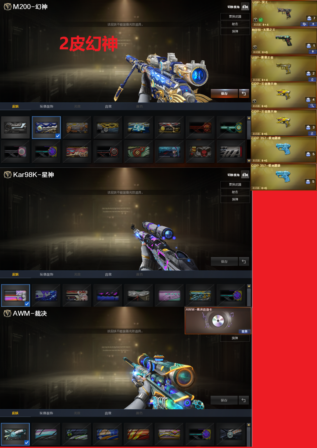 装备描述:排位:可以、、、、、、、、、、、爆破四防:幻神2皮(YZK、KZ皮肤)、98K星神、、、、、、USP冥王、USP雷暴王者、2个王者COP堕天神、柯尔特-无冕之王、2个COP极地霜雄、、、、、G36幻影、传说浩劫、神威天绫、传说光耀、QBZ191-银翼、QBZ幻兽、白虎(光海夜岚皮肤)、2把炽芒蝶刃、、、裁决音效、白虎音效、、、6套雷暴王者、、、爆破四防(传说女帝、雨棠)