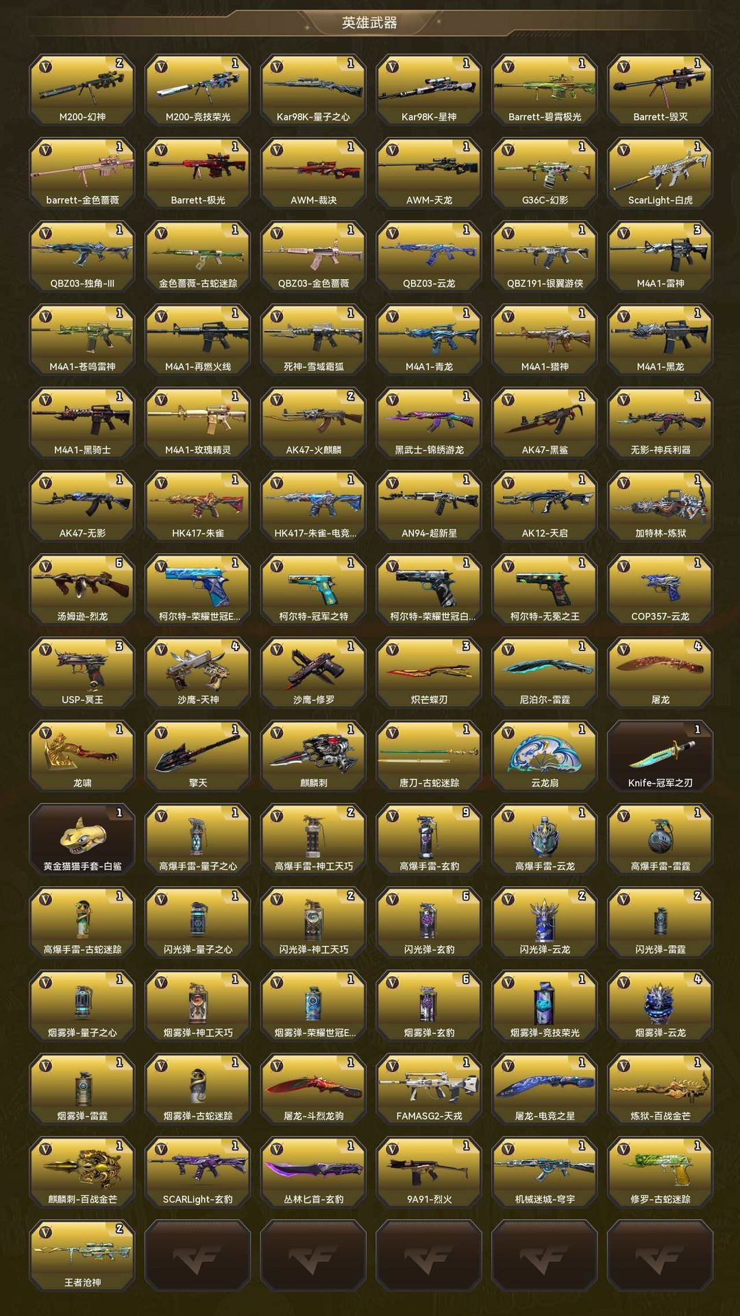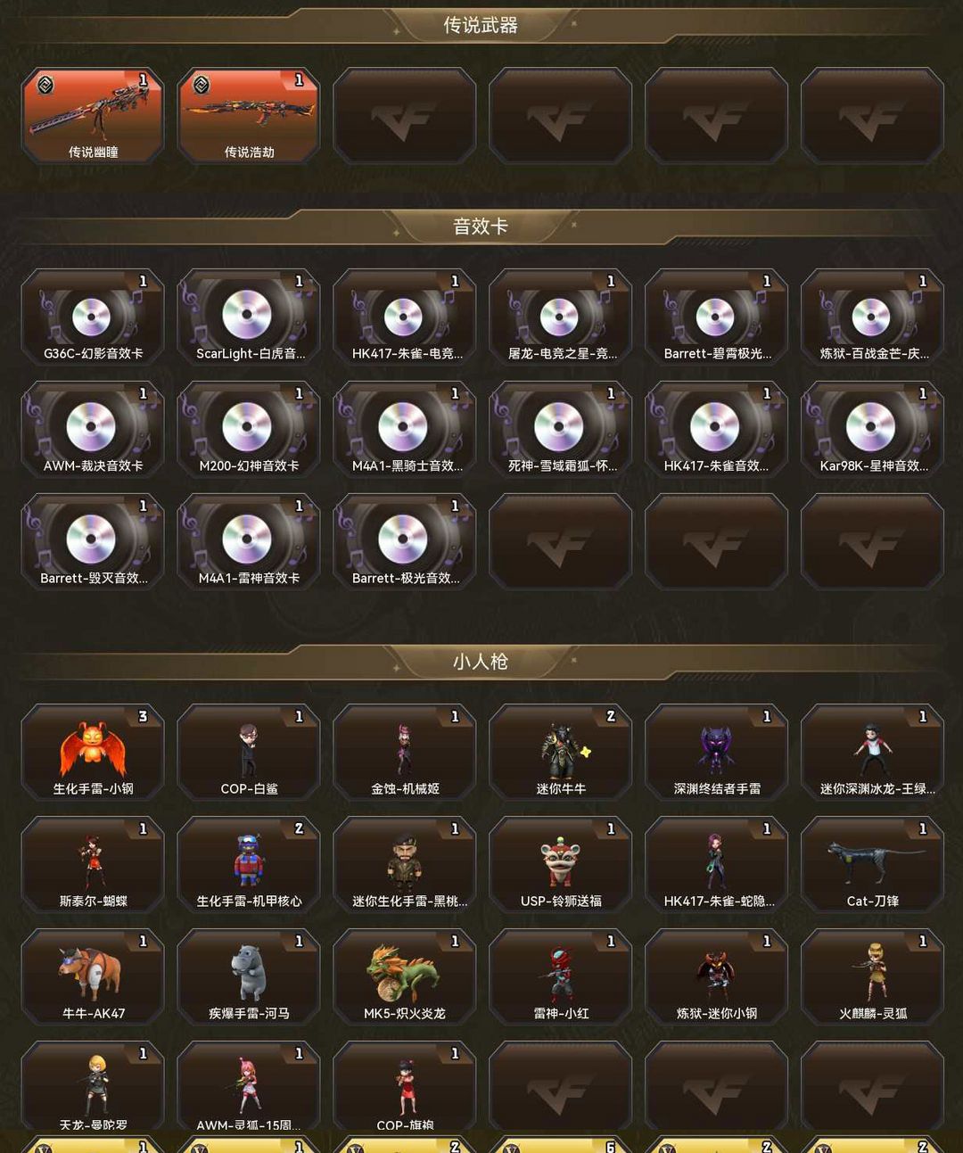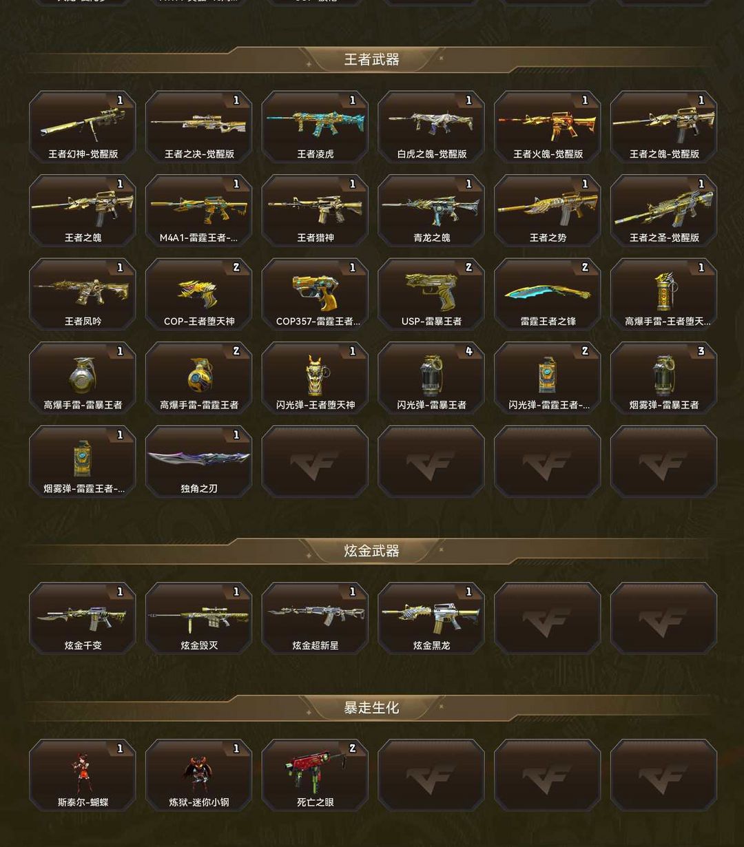 装备描述:本账号专精爆破模式 生化模式双全装,配置全网顶级稀有装备!核心武器:传说幽瞳(瞬狙之王)、幻神(皮肤+音效卡)王者幻神(超稳连狙)、星神(皮肤+专属音效卡)、白虎之魄(高伤爆破)、毁灭(皮肤+音效卡),冠军全套皮肤,冠军白鲨2023套装,柯尔特无冕之王 ,云龙套装,王者雷霆套装,制霸全场,大沙四方