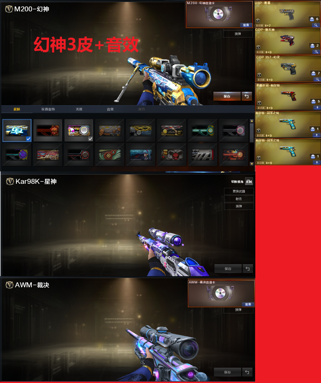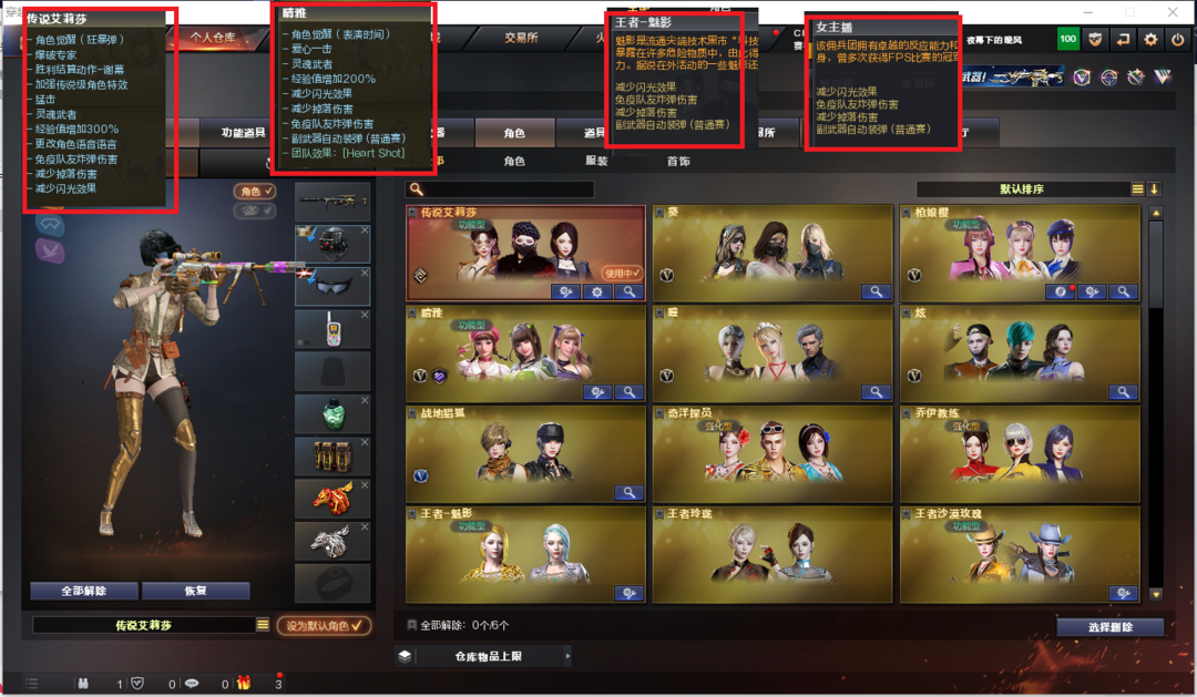 装备描述:排位:可以、、、、、、、、、、、、、爆破四防:3皮幻神+音效(冠军之幻、丹凤、动感闪耀皮肤)、98K星神、王者星神、裁决皮肤带音效、、、USP雷暴、COP堕天神、COP幻灵、世冠柯尔特、2个冠军之特、、、、传说暗裔、白虎、QBZ天罚、QBZ金色蔷薇、炽芒蝶刃、、、幻神音效、裁决音效、蔷薇音效、白虎音效、毁灭音效、雷神音效、极光音效、黑龙音效、屠龙音效、火麒麟音效、黑骑士音效、、、、4套雷暴、5套堕天神、1套夜魔、4套幻灵、1套竞技荣光、2套神工天巧、1套雷霆王者、1套王者之魄、、、爆破四防(晴雅、传说艾莉莎、枪娘樱、王者魅影、女主播)