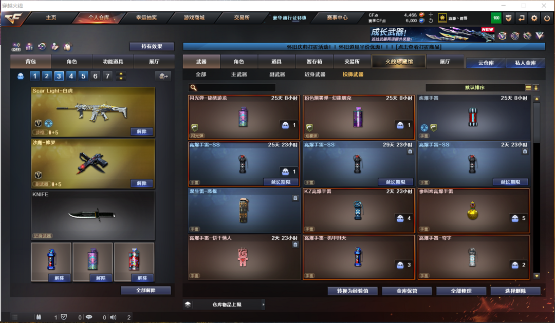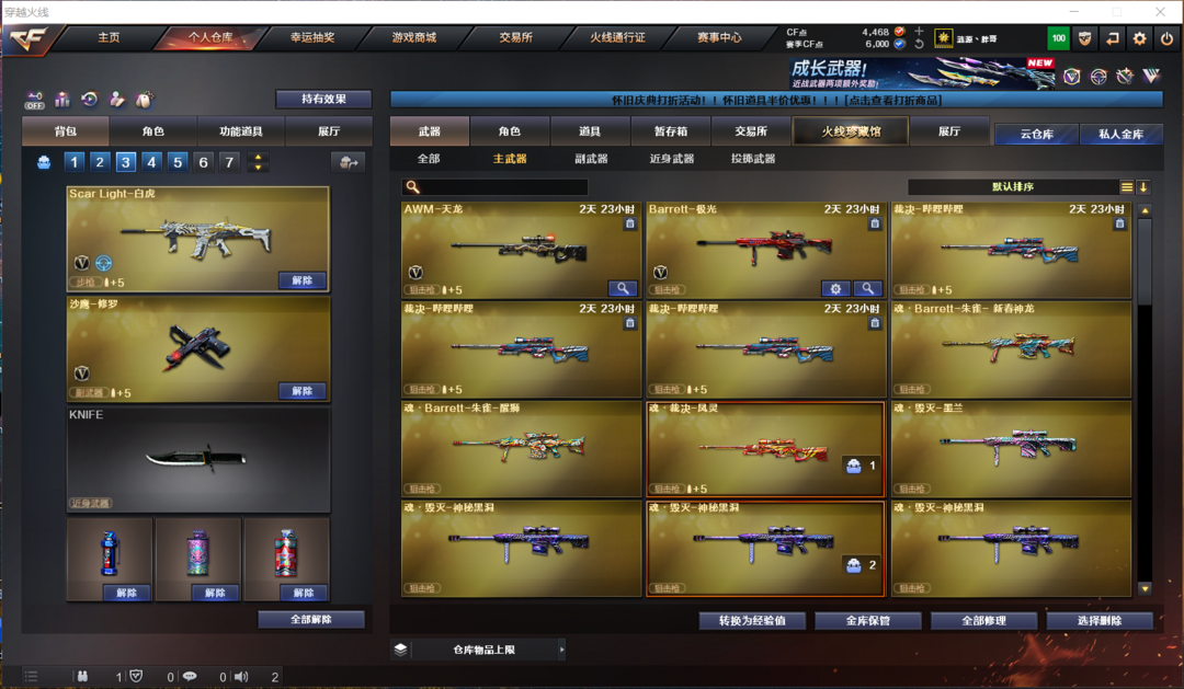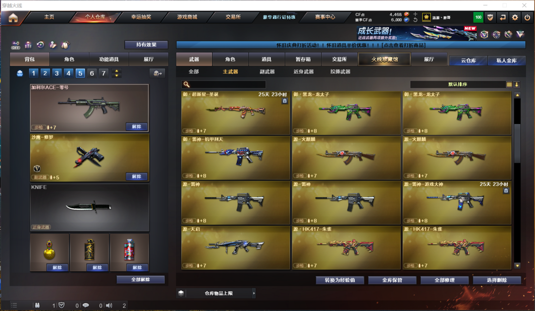 装备描述:英雄武器:加特林-炼狱;Scar Light-白虎;M4A1-黑骑士;M14EBR-玄武;加特林-炼狱;Barrett-极光;沙鹰-修罗;屠龙;M4A1-黑骑士;M4A1-雷神;AK47-火麒麟;M4A1-黑龙;AWM-天龙;机械迷城-穹宇;黑武士-锦绣游龙;无影-神兵利器 角色:零;猎狐者;刀锋;灵狐者;活力灵狐;新娜塔莎;夜玫瑰-X;圣诞潘多拉-X;风暴女;嘉年华灵狐;游珑儿;芳心审判者