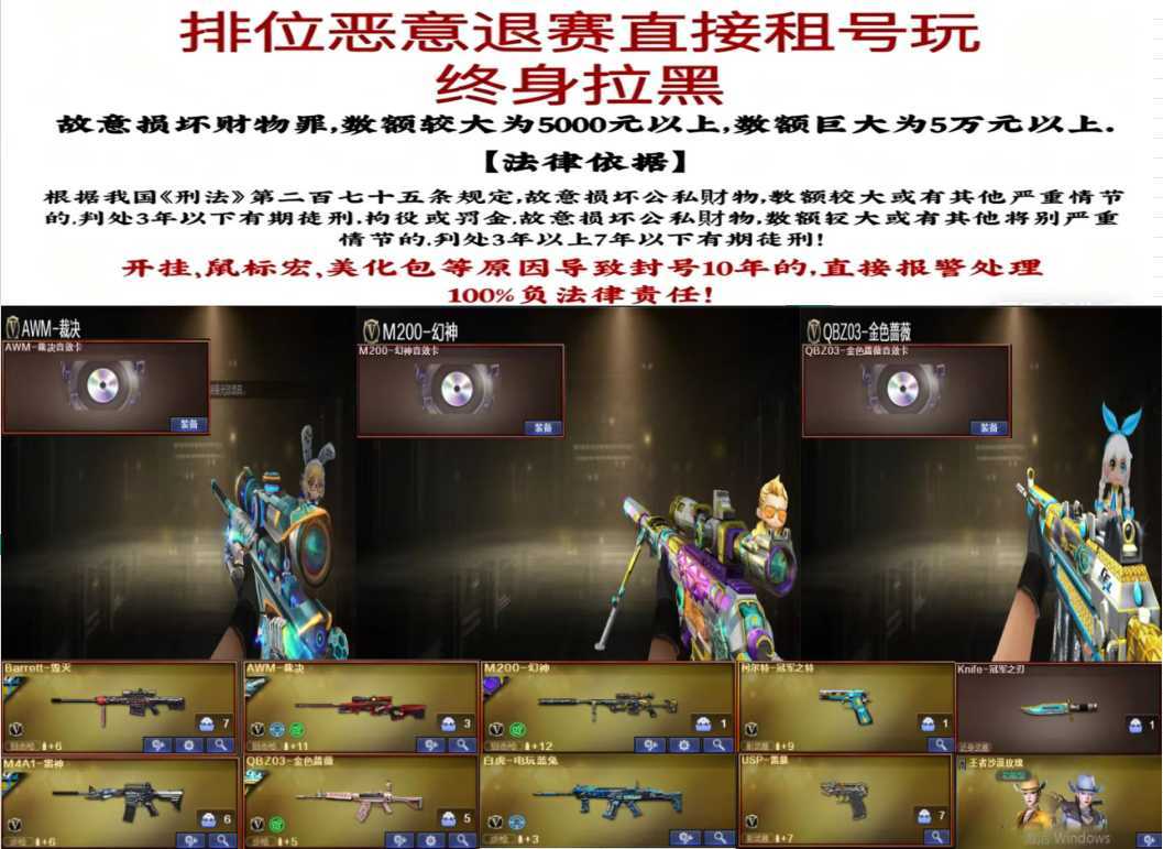限制: 租号1次及以上 | 撤单率<90%才可租用此帐号装备描述:此号已在当地派出所备案,如有开挂科技选手,必找平台索要租客信息,找团队律师控告到底!
