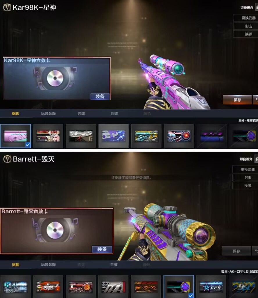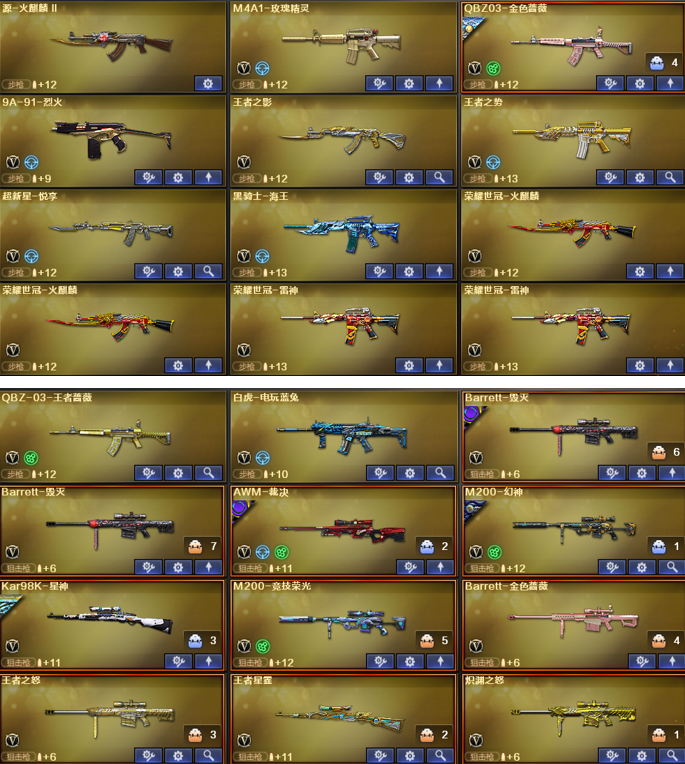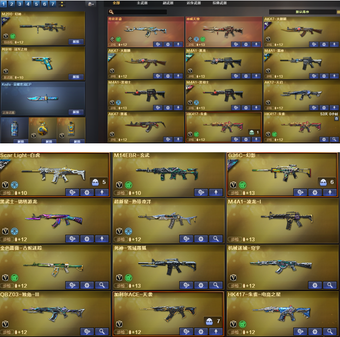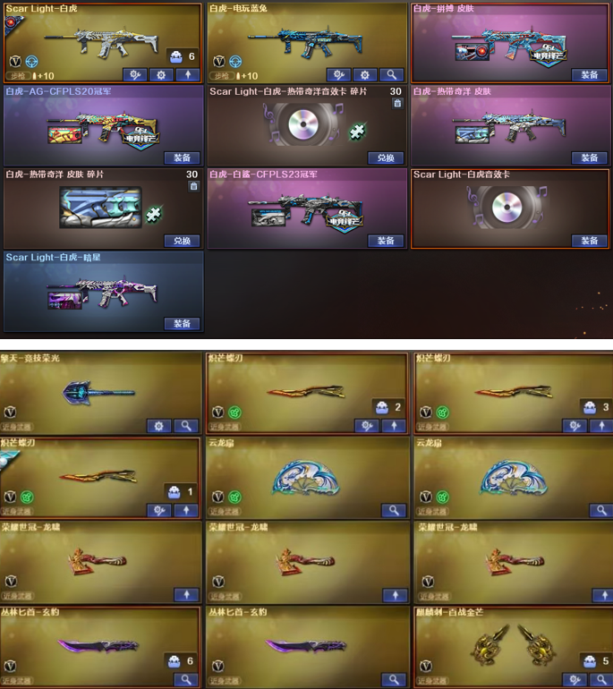 装备描述:神威天绫、神威莲华、传说影煞、传说星骇、传说圣谕、幻神Kz、EP世冠全套、白鲨世冠、欧欧、AGS24、AGS17、星火小队、动感、丹凤、幻神音效卡;幻影,加利尔ACE-天袭,白虎5皮、白虎音效、星神6皮、星神音效,王者星霆,M200-经济荣光,裁决5皮、裁决音效卡、冠军之特*2、白鲨柯尔特、荣耀世冠、荣光柯尔特、EP柯尔特、冥王USP,王者雷暴USP、神功天巧USP、云龙COP*2、妮妮、鹰、隼、云悠悠、关小羽,星际战将,炽芒蝶刃*3、COP幻灵*2