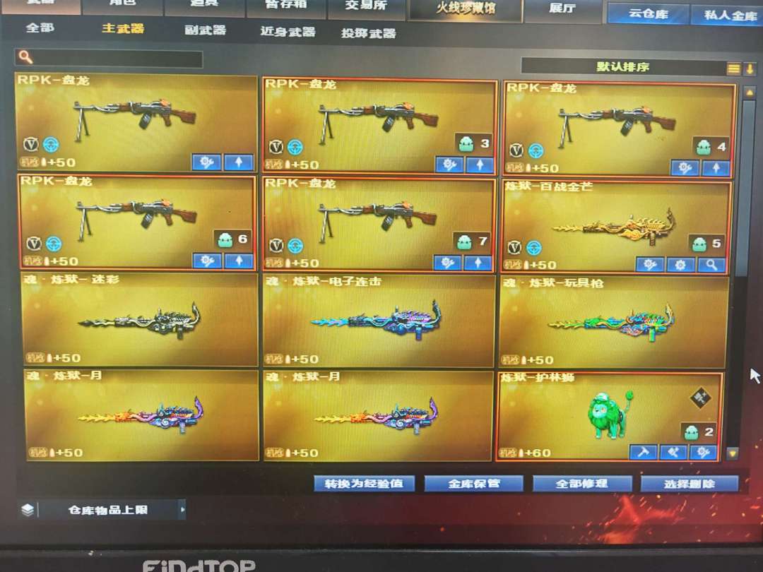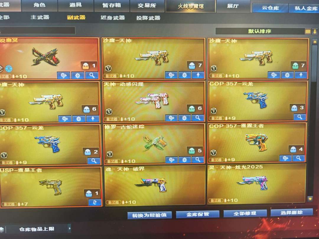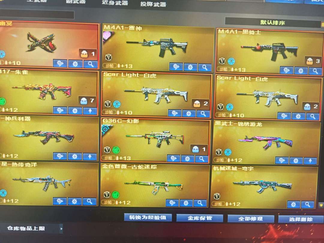 装备描述:生化小顶配号,神威莲华,双炼狱狮子,6盘,双斯太尔蝴蝶,双蝴蝶刀,Mac鲨鱼, 爆破幻影幻神白虎qbz,COP小钢炮,王者雷暴 挑战黄金套六黑,七黄金玩偶