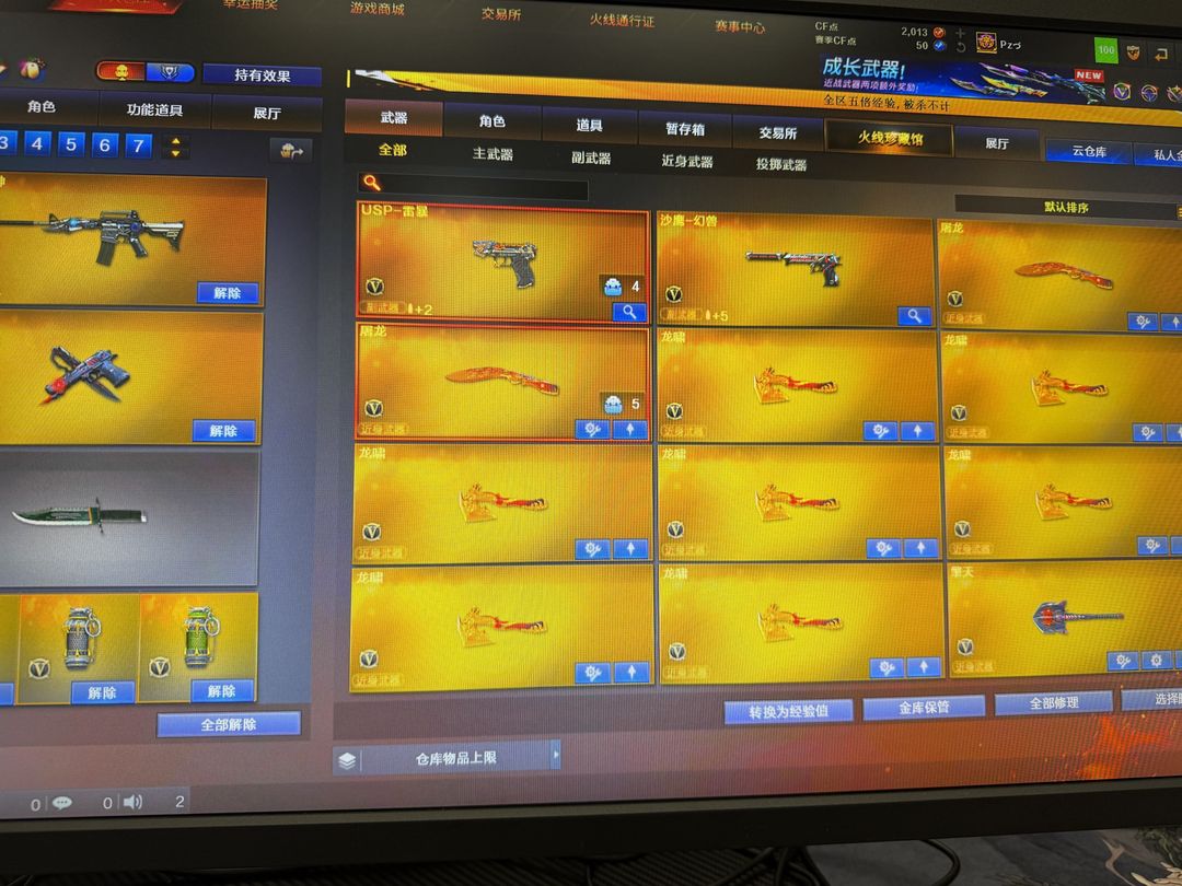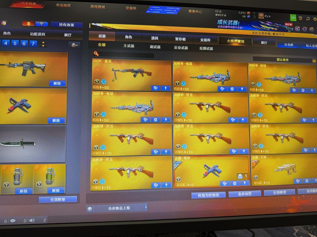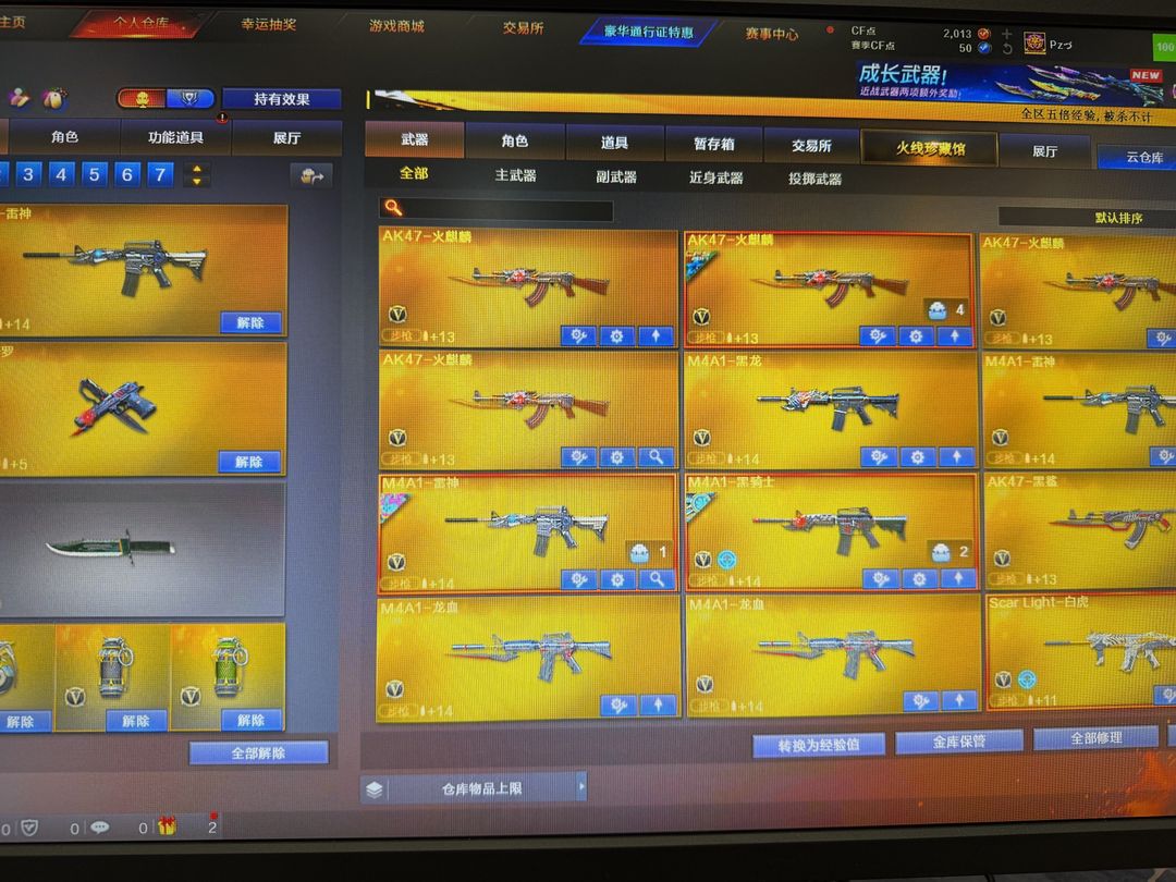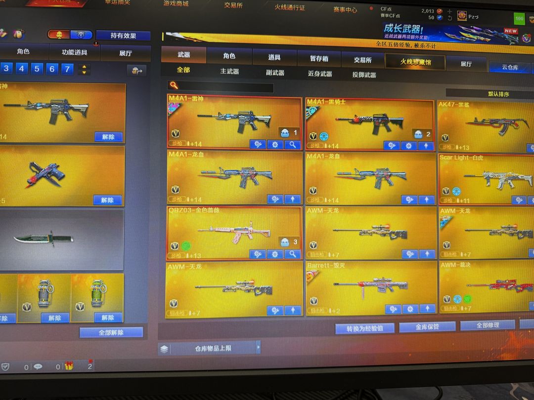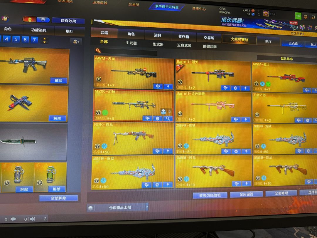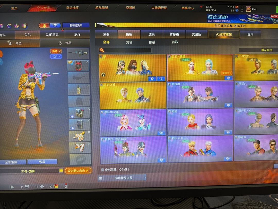装备描述:王者武器:王者之怒-觉醒版;王者之啸;王者之影;王者之势;王者之心;王者之光;王者之武;炼狱-悦蓝 英雄武器:M4A1-雷神;RPK-盘龙;Scar Light-白虎;QBZ03-金色蔷薇;M4A1-黑骑士;高爆手雷-雷暴;烟雾弹-雷暴;闪光弹-雷暴;斩神刀-雷暴;USP-雷暴;M200-幻神;加特林-炼狱;龙啸;AK47-黑鲨;M4A1-龙血;AWM-裁决;AK47-火麒麟;Barrett-毁灭;沙鹰-天神;女皇利刃-幻兽;沙鹰-幻兽;烟雾弹-幻兽;闪光弹-幻兽;高爆手雷-幻兽;麒麟刺;AWM-天龙;汤姆逊-烈龙;擎天;M4A1-黑龙;屠龙;沙鹰-修罗 角色:葵;猎狐者;潘多拉;幻影;堕天使;活力灵狐;G.E.M.邓紫棋;王者之瞳;夜玫瑰;陈龙野-X;娜塔莎;王者复仇;灵狐者;新娜塔莎;王者-魅影;北极狐-X;妲己;娟娟;紫霞;邱刚敖;风暴女;圣诞潘多拉-X;潘多拉-锋芒精英;兔囡囡;嘉年华灵狐;雷豹;金戈;铁骑 道具:手枪弹匣;冲锋枪弹匣;步枪弹匣;防弹头盔;C4工具钳;手雷包;防弹衣;夺命之镰;防化服;猫耳头盔;防弹头盔;C4工具钳;手雷包;防弹衣;变相怪杰;银蛇戒;炫彩背包;兔