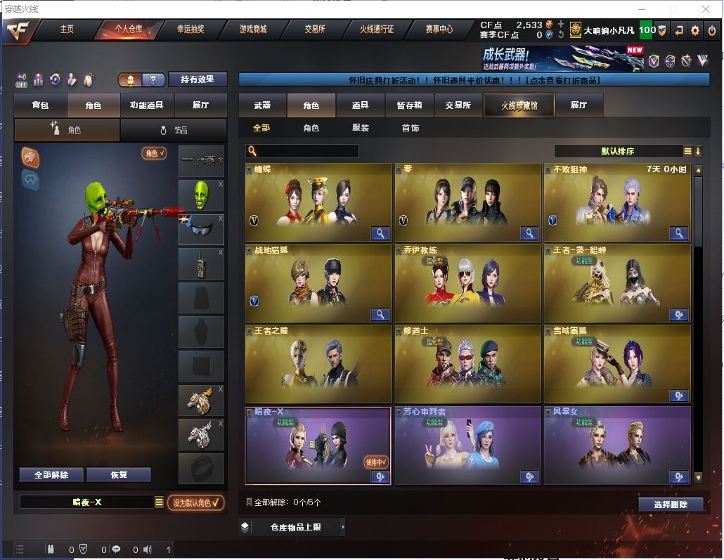 限制: 租号1次及以上 |装备描述:英雄武器数:80V 王者武器数:6 王者 雷霆套装数:1 幻兽套装数:7 会员等级:6 2黑骑士,5修罗 王者武器:王者之心,王者之势,王者之光,王者之力,王者之魄,王者之翼 特殊武器:cop357雷霆,AK火麒麟,M4A1雷神,巴雷特毁灭,破空枪刃 稀有角色:狐影,幻影,复仇者,堕天使,蝴蝶,零,炫,葵,王者零 稀有道具和皮肤:毁灭音效卡,火麒麟音效卡,能量核心