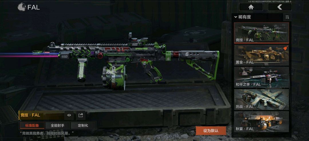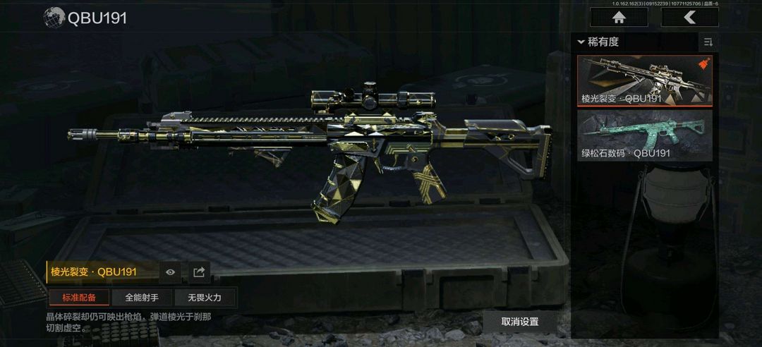 装备描述:火绒塔莉娅,都护铁衣战术甲胄,鎏金街头套装;玉鸾挂枝手套; 竞技FAL,黄金FAL,伦琴幻影H416,告丧夜曲AUG,旗帜AEK,钢铁真理QBZ191,和平之手FAL,棱光裂变AKM,缟兵玄墨AKM,德尔塔小队M4A1,竞技M4A1,黑金国际M4A1,竞技MDR,棱光裂变AK102,火力倾泻AUG,棱光裂变AK74N,来战AK74N,最后防线AKS74U,赢家F2000,雪山之王F2000,炎夏浪花AR57,竞技AR57,涂绘猎人AR57,棱光裂变ACE31,湖冰倒影ACE31,火绒AN94,武侍FAMAS,缟兵玄墨T03,玄戈梨花T03,火绒AK12,07式林地迷彩QBZ191; 湖冰倒影MP5,玄戈梨花MPX,雪山之王MPX,高塔之内P90,灰鼠幻歌P90,超越自我Vector9; 冰河碎影MK14,棱光裂变QBU191,饰金VSS,高塔之内VSS,缟兵玄墨VSS,玄戈梨花VSS,白狼连队VSS,骑士之剑MK14,竞技M110,伦琴计量M110,缟兵玄墨M110,玄戈梨花M110,全地形数码M110; 棱光裂变莫辛,饰金AX50,超越自我AR30,武侍SJ16,骑士之剑SJ16;