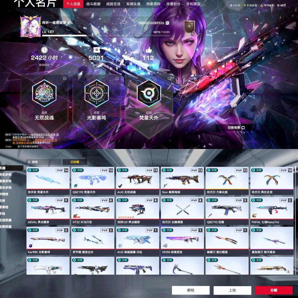 装备描述:✨号上资源✨ 一、最新皮肤: ✨AUG高能磁爆—闪击套装✨ ✨6星UIZ界点穿梭+巨浪✨ 二、转盘系列: ✨幽冥海域(Scar) ✨狂龙降世(192) ✨无双战魂(Aug) ✨繁星天外(192) ✨光影鸣奏(98K) ✨尖峰袭猎(Nar) 三、氪金红皮系列: ✨1.七海联动全套 ✨2.双截棍蛟龙出水 ✨3.可露凯全套 ✨4.娜美西丝狙 ✨5.霓幻蝶息蝴蝶刀 ✨6.神耀圣裁全套(带背饰) 四、人物皮肤及变异角色 ✨1.超多人物和装扮配件,4红皮角色 ✨2.变异角色全母体(魅影过期可以直接用号里的吉吉币买),全小变异体 ✨3.有游侠机甲和新机甲皮,有波波沙,爽玩变异 注意事项 1.本号充值过万,并在河南省郑州市备案 2.严禁任何形式的开挂,坐挂车行为,发现必追究到底 3.严禁恶意卡游戏地图bug,造成封号必追究到底 4.可排位,严禁恶意掉分,挂机,逃跑等行为 5.请勿浪费或随意交易号内重要资源 6.请大家尊重号主选择,请勿更改游戏ID! 7.手机APP下单更便宜,大约节省30% 8.请大家自觉遵守规定,祝玩的开心