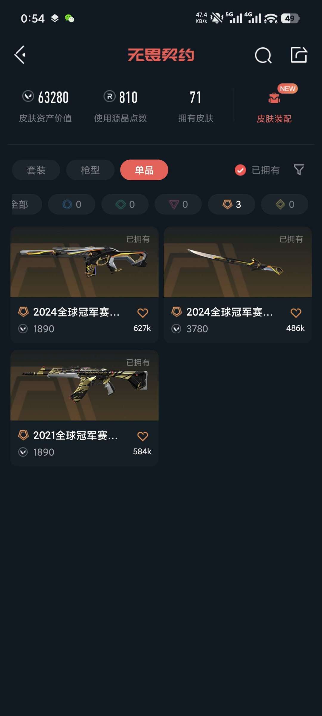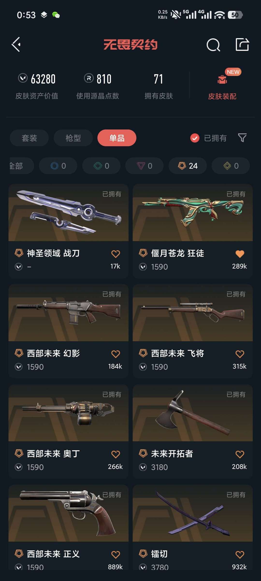 装备描述:21狂徒 24冠军套 混沌狂徒 西部未来 显卡爪刀 创纪元 堕天遗武套 禁打排位