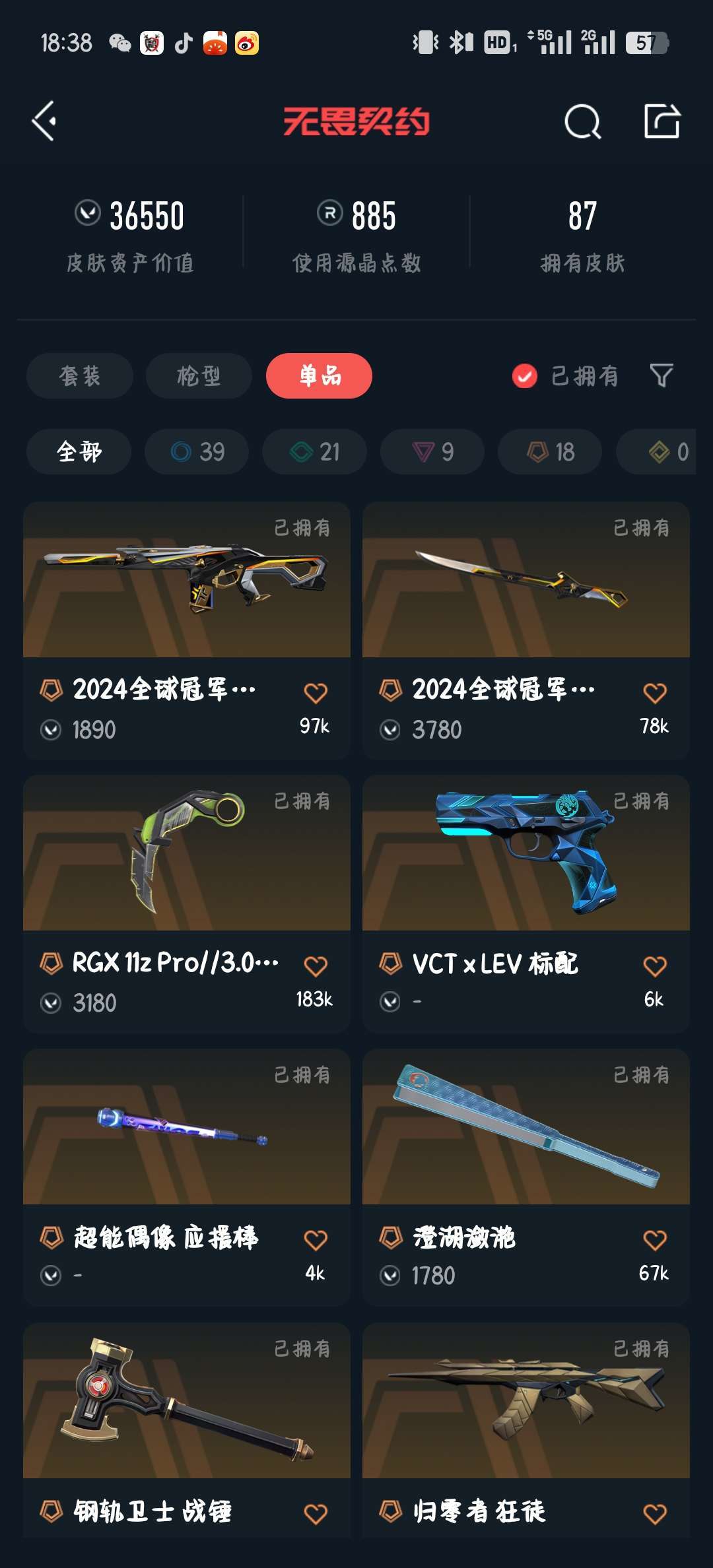 装备描述:显卡爪 威龙之刃 太极扇 24冠军套 鱼缸猴子弃王归零龙混沌ak 莲花侦查破败幻影 离子大狙 破败戍卫 波普獠犬 vct标配 龙鬼魅 奇点正义 盖亚战神