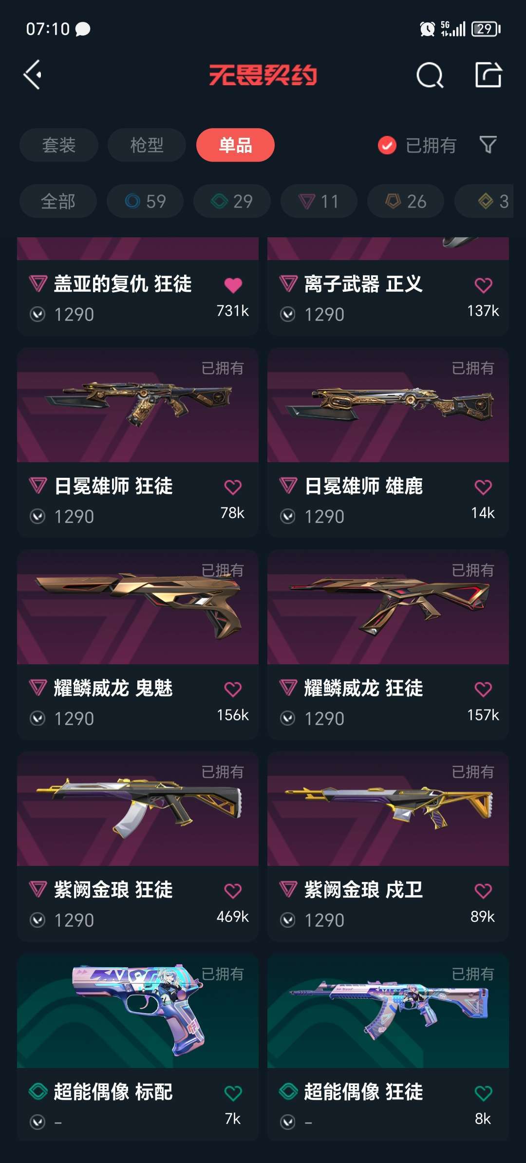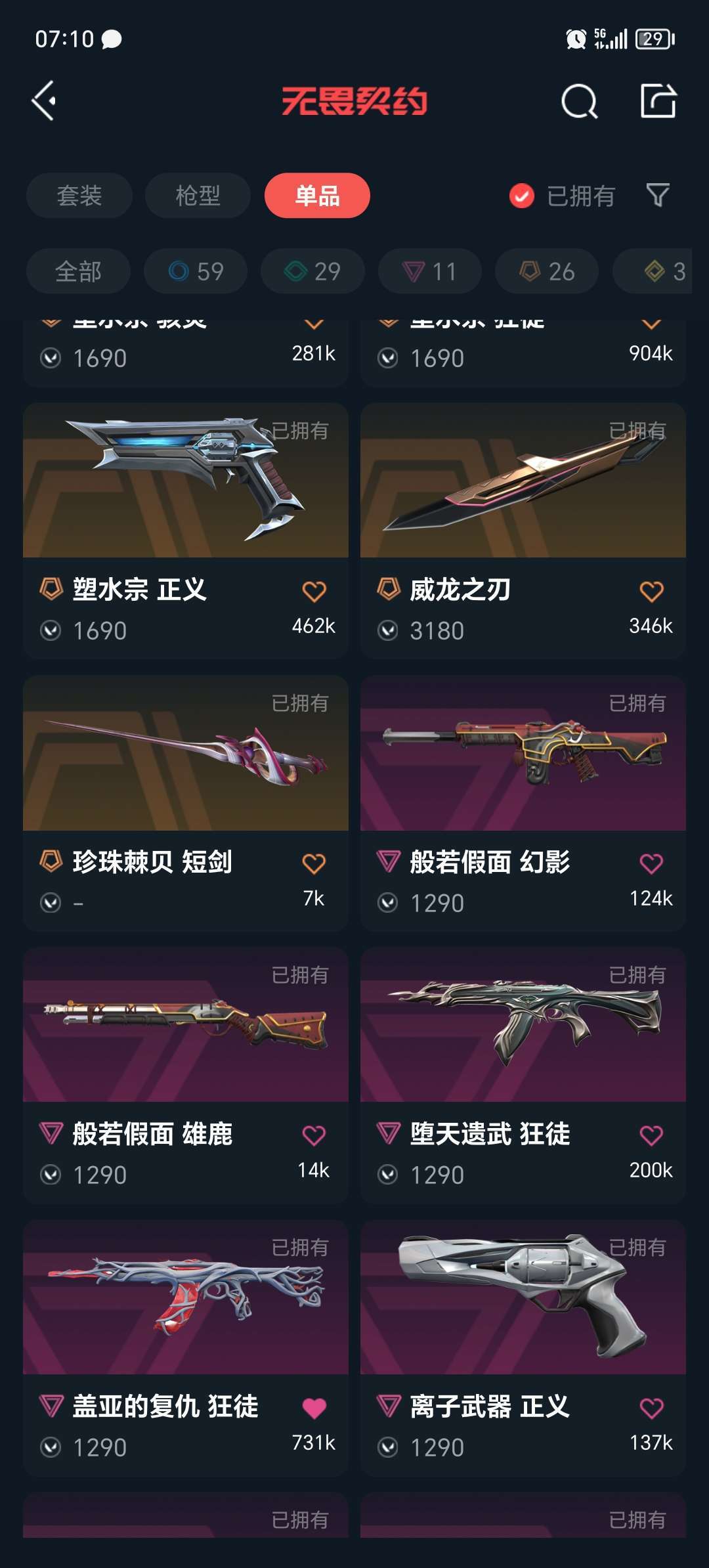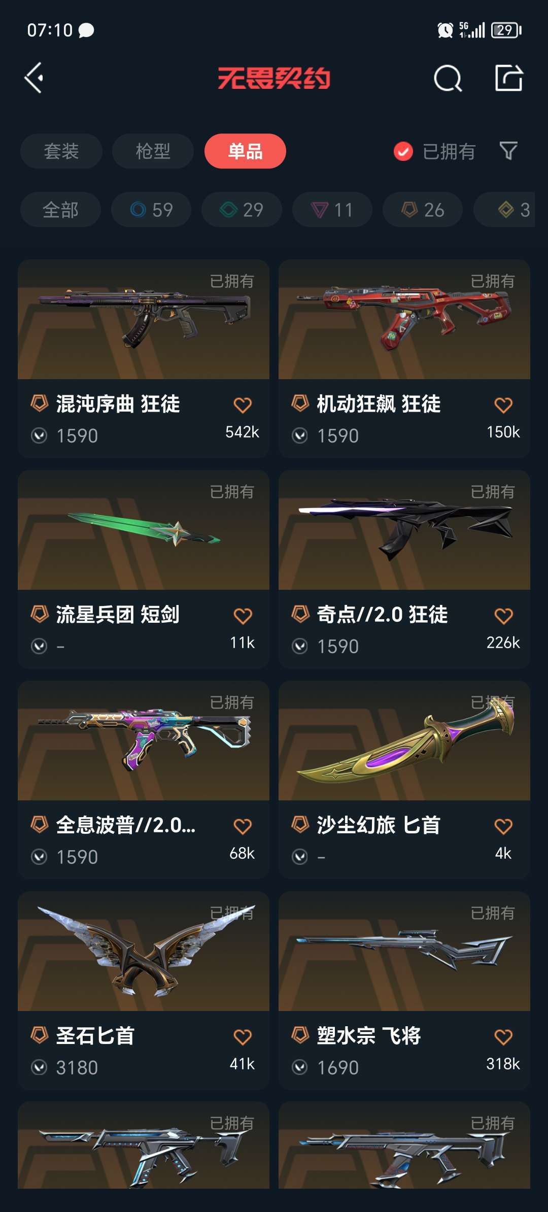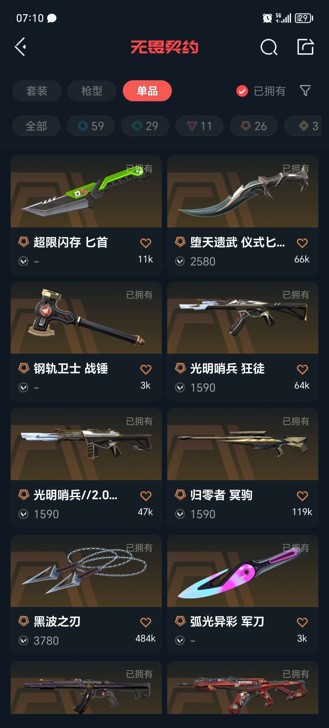 装备描述:狂徒:盖亚 紫金 21年限定 混沌 激动狂飙 弃王遗思 光明哨兵 艾瑞丽的梦之翼 耀凌威龙 塑水宗 奇点2.0 全息波普 日冕雄狮 幻影:24年限定 般若假面 光明哨兵 正义:塑水宗 离子 近战:显卡爪刀 黑波之刃 威龙之刃 堕天遗武反手刀 光明哨兵近战