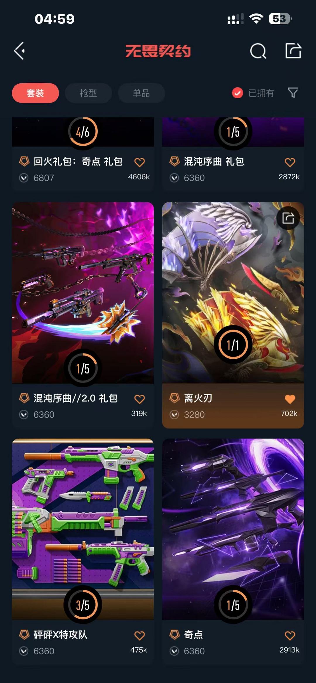 装备描述:全英雄五把限定冠军枪皮三把限定冠军刀皮+离火刃+情人节卡面