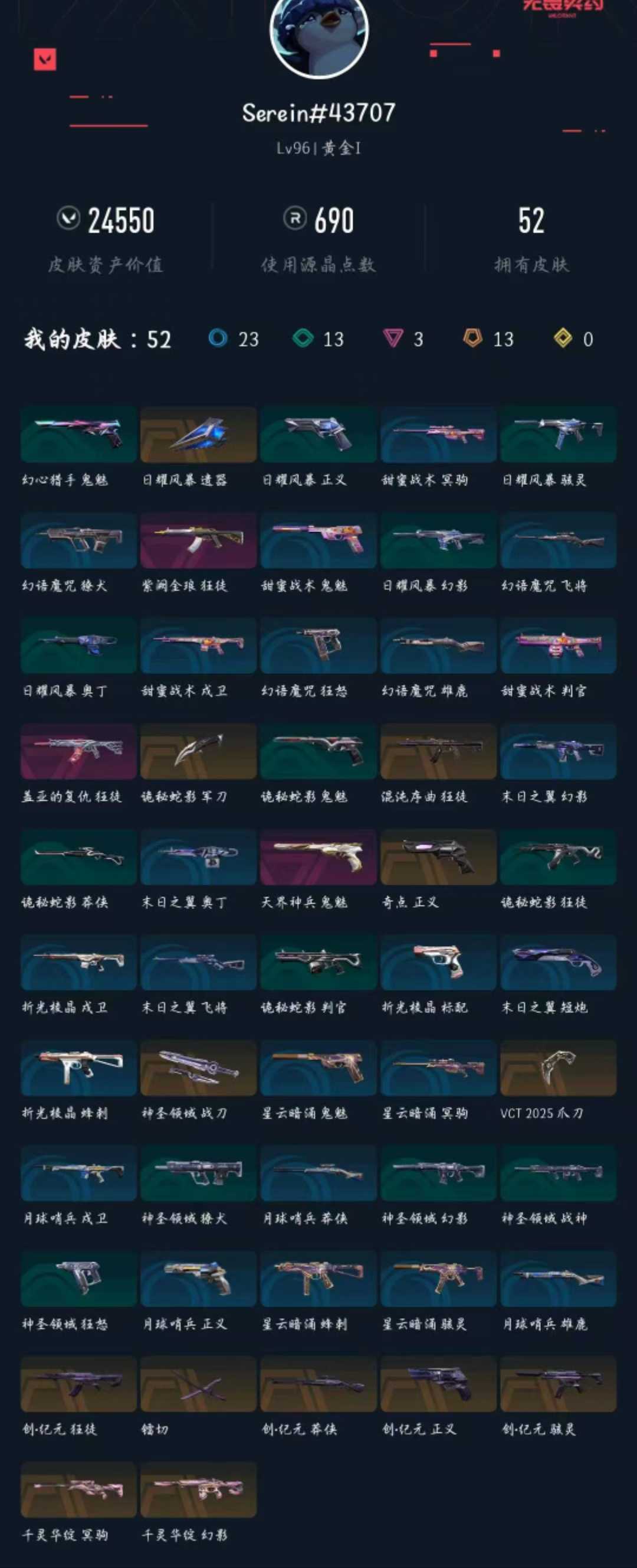 装备描述:盖亚的复仇VCT2025爪刀创纪元全套镭切千灵华绽神圣领域混沌序曲奇点正义诡秘蛇影紫阙金琅日耀风暴