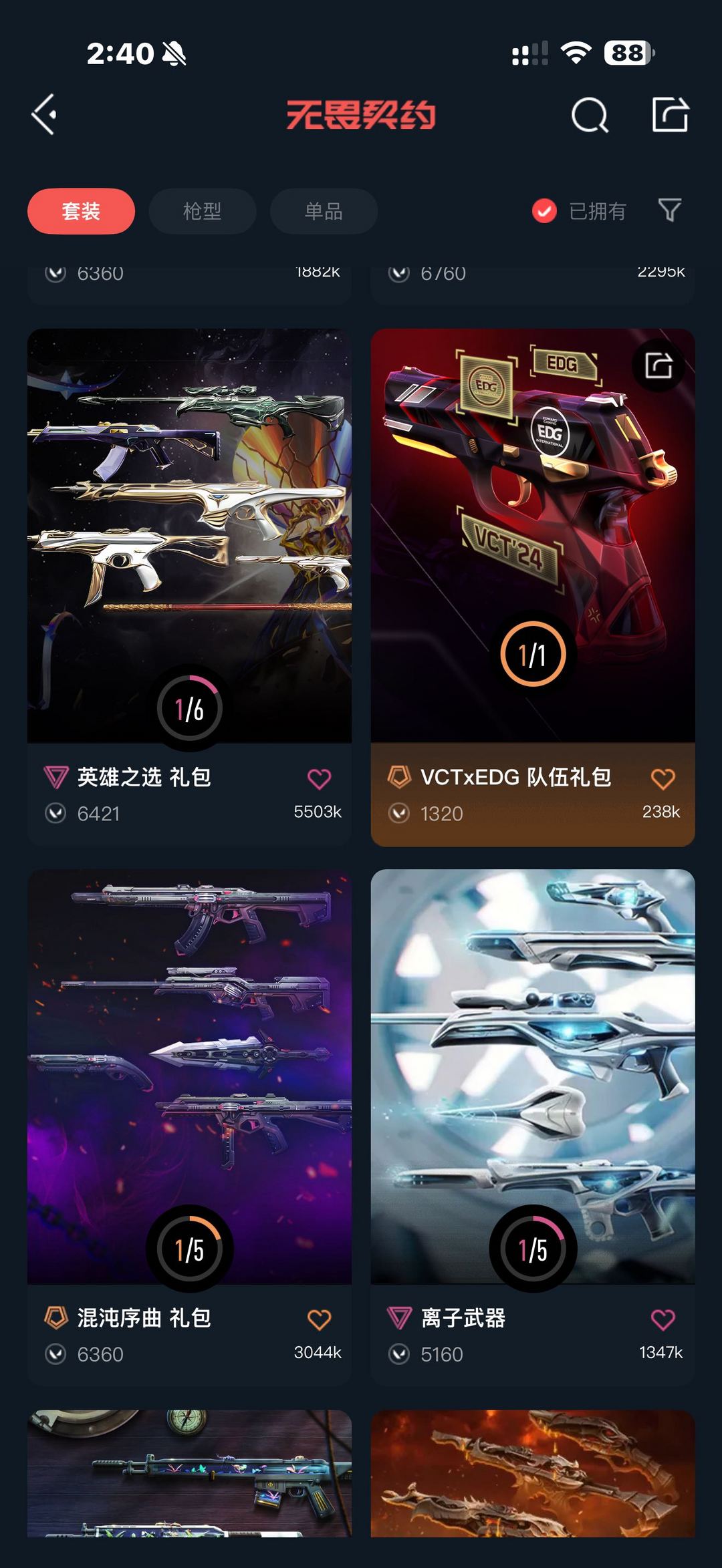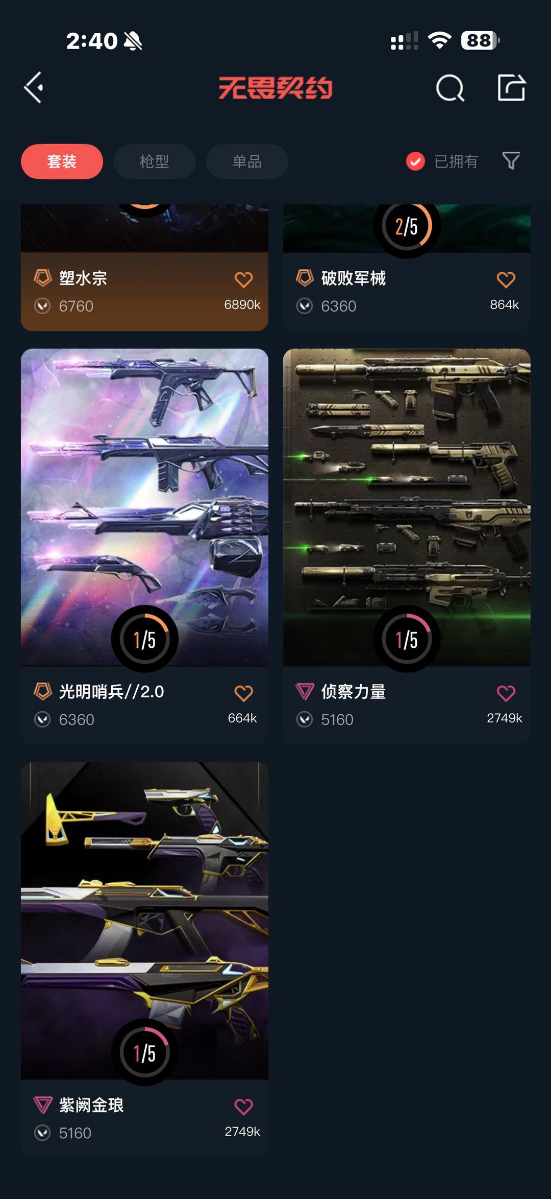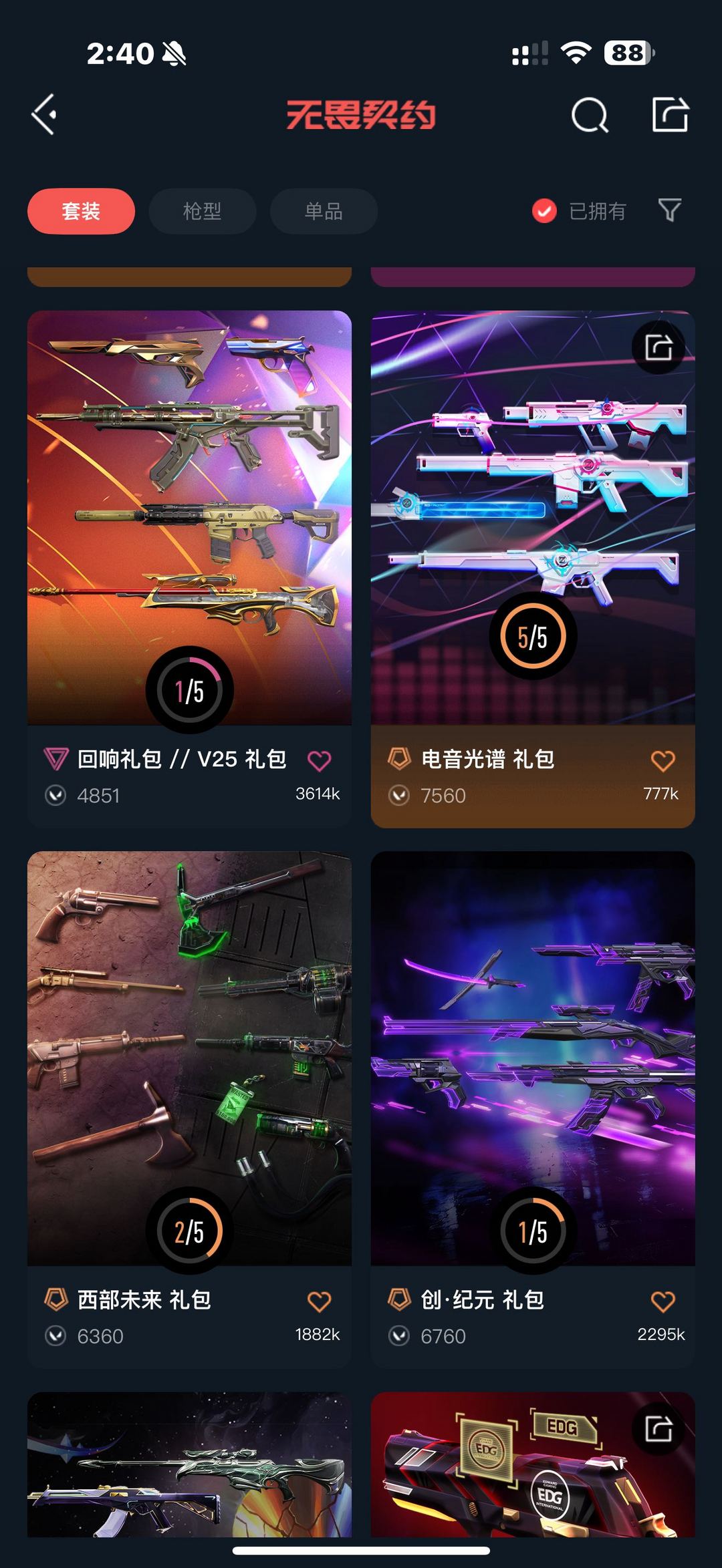 装备描述:25冠军套,掠夺2.0套,塑水套,光谱套,侦查,混沌,紫金,流脓,离子大狙,边陲正义,破败半套,24 25EDG标配,雷切