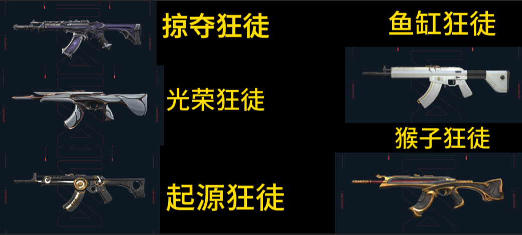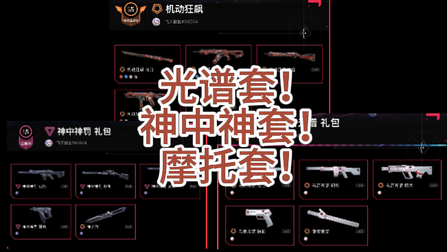 光谱套,摩托套,神中神套,掠夺,盖世,起源,鱼缸,光荣狂徒,781协议幻影,光荣大狙,西部鸟狙