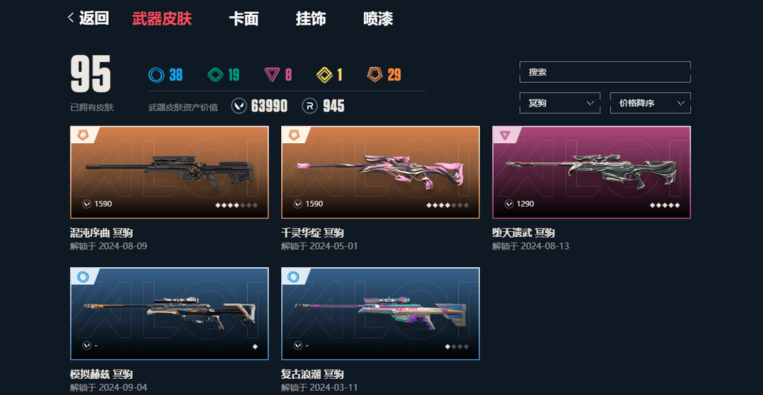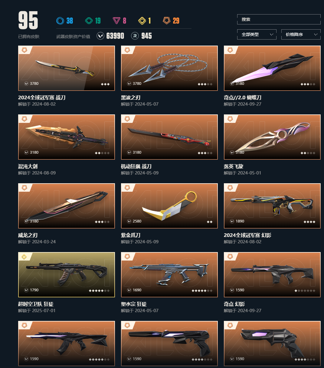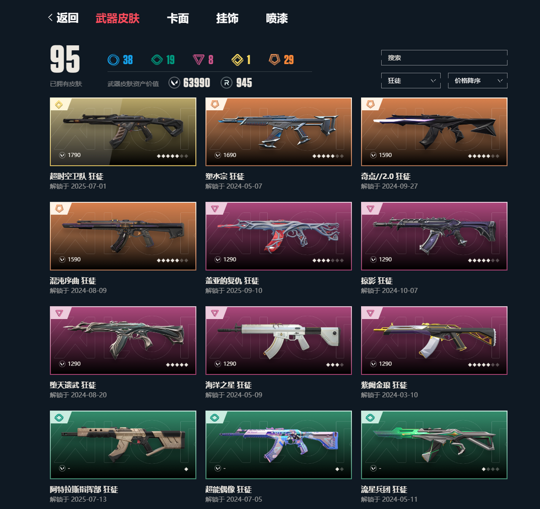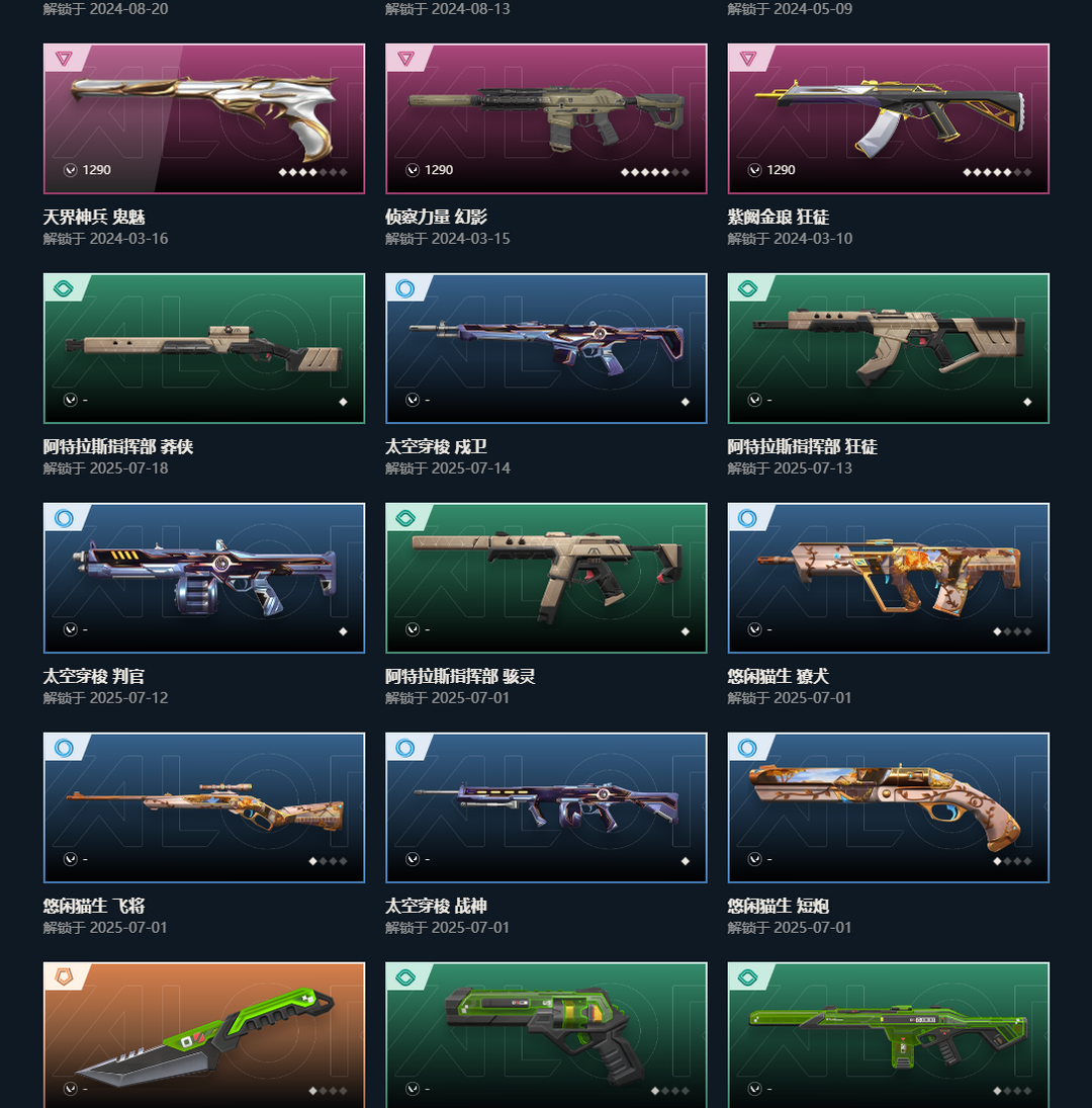 装备描述:随身武器:(千灵华绽 正义 炫彩1);(千灵华绽 正义 炫彩2);(千灵华绽 正义 炫彩3);(混沌序曲 短炮 炫彩2);(混沌序曲 短炮 炫彩3);(混沌序曲 短炮 炫彩1);(奇点//2.0 鬼魅 炫彩3);(奇点//2.0 鬼魅 炫彩2);(奇点//2.0 鬼魅 炫彩1) 冲锋枪:(混沌序曲 蜂刺 炫彩2);(混沌序曲 蜂刺 炫彩3);(混沌序曲 蜂刺 炫彩1) 霰弹枪:(千灵华绽 判官 炫彩1);(千灵华绽 判官 炫彩2);(千灵华绽 判官 炫彩3) 步枪:(盖亚的复仇 狂徒 炫彩3);(盖亚的复仇 狂徒 炫彩1);(盖亚的复仇 狂徒 炫彩2);(侦察力量 幻影 炫彩2);(侦察力量 幻影 炫彩3);(海洋之星 狂徒 炫彩1);(千灵华绽 幻影 炫彩1);(千灵华绽 幻影 炫彩2);(千灵华绽 幻影 炫彩3);(混沌序曲 狂徒 炫彩2);(混沌序曲 狂徒 炫彩1);(奇点//2.0 狂徒 炫彩1);(奇点//2.0 狂徒 炫彩3);(超时空卫队 狂徒 炫彩2);(超时空卫队 狂徒 炫彩3) 狙击步枪:(千灵华绽 冥驹 炫彩1);(千灵华绽 冥驹 炫彩2);(千灵华绽 冥驹 炫彩