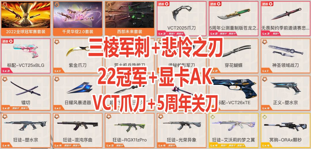 可排位✅顶级10W库存✅超时空三棱刀⭐22冠军套⭐季前邀请赛悲悯之刃⭐显卡AK⭐5周年关刀⭐VCT爪