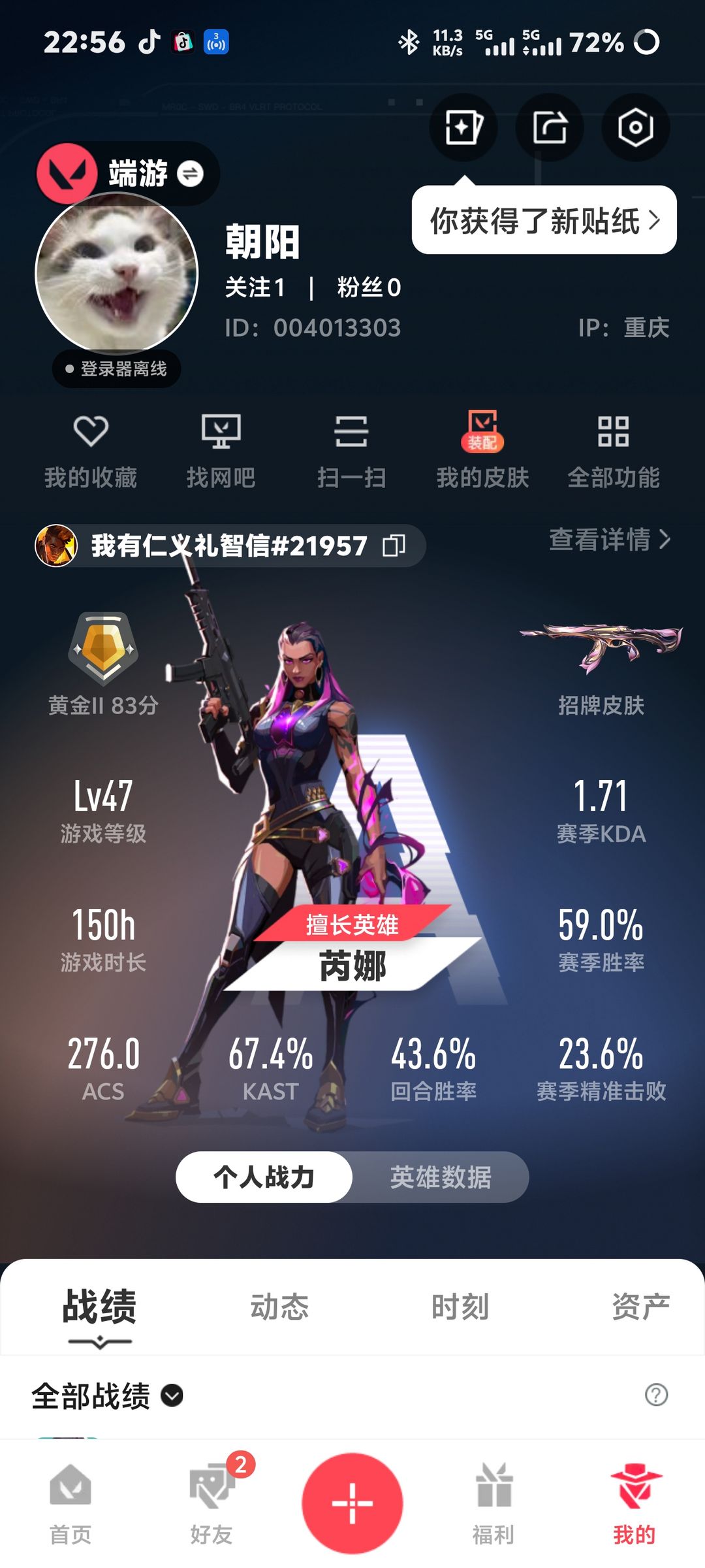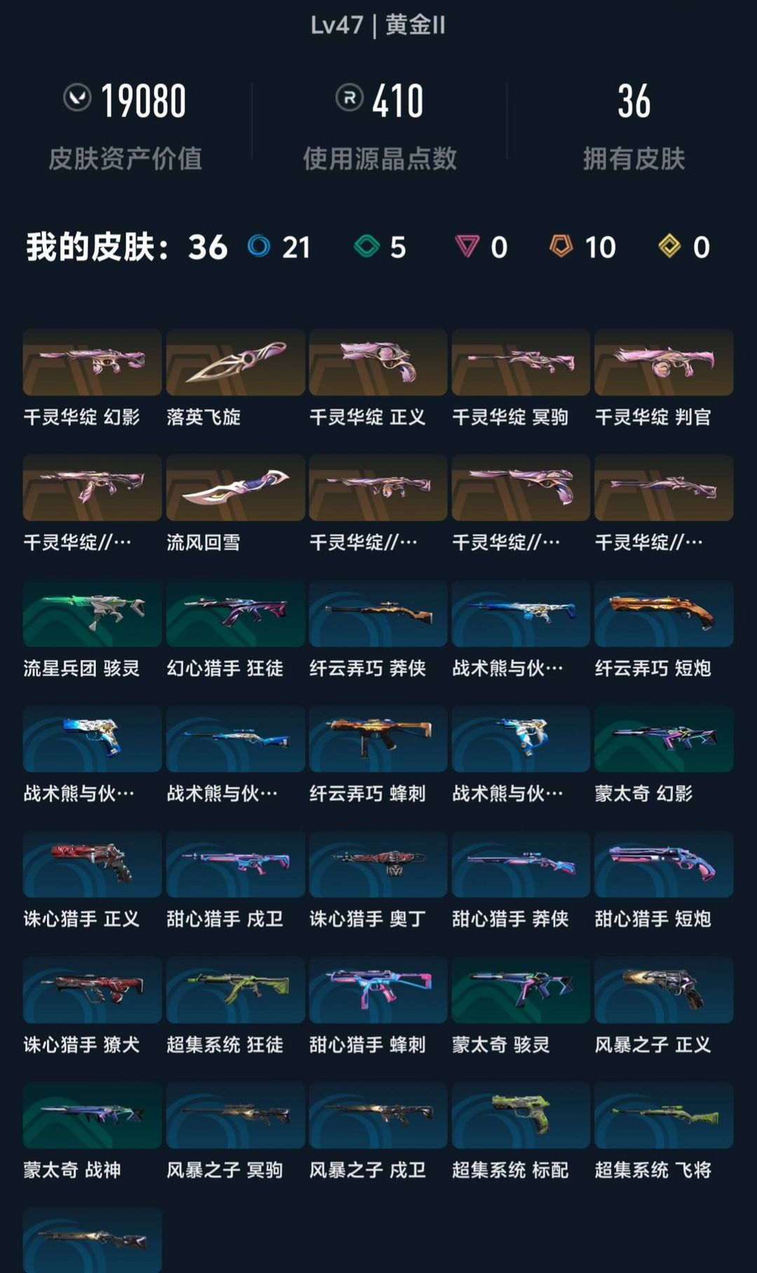 装备描述:等级:47 级,150 小时游戏时长,赛季胜率 59.0%,KDA1.71,可正常排位匹配 皮肤核心:千灵华绽全套 + 千灵华绽 //2.0 全套(双套 5/5 毕业),包含幻影、正义、冥驹、判官等热门枪型,颜值拉满 其他皮肤:蒙太奇、诛心猎手、甜心猎手、超集系统、风暴之子等多系列皮肤,共 36 款,覆盖步枪、狙击、霰弹、手枪全品类 资源储备:源晶点数 410,皮肤资产价值 19080,可直接体验多款特效皮肤