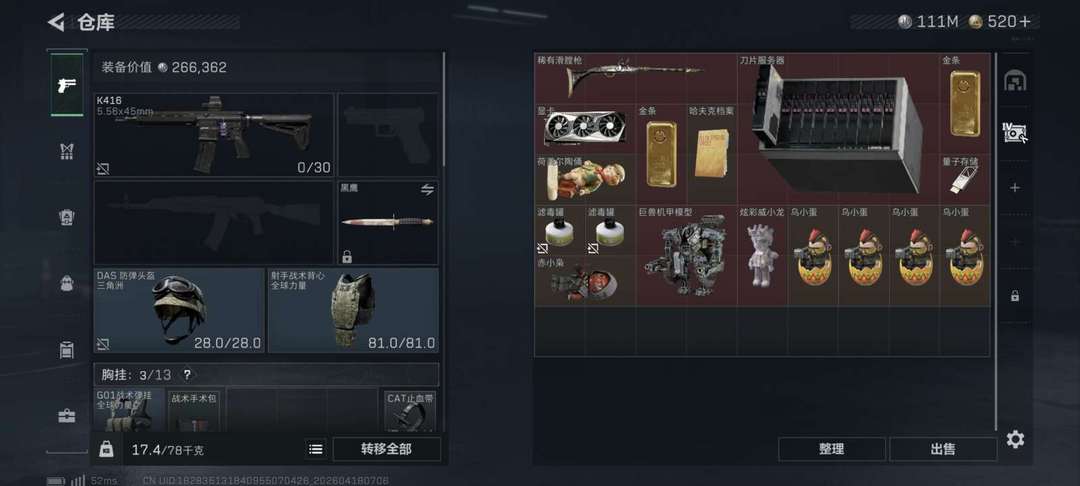 装备描述:纯币一亿一千万5百万藏品箱里面的不能卖 打包出售售价包含所有除藏品箱例外