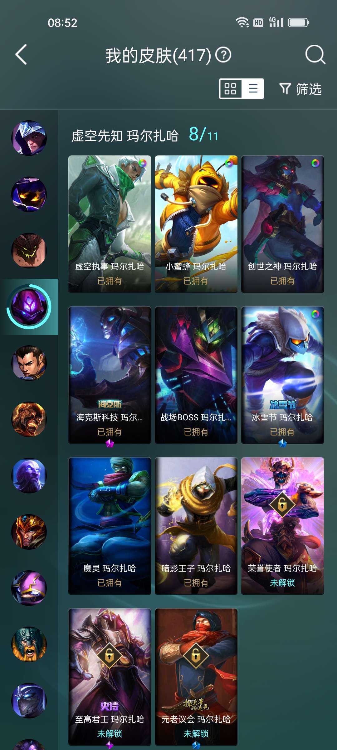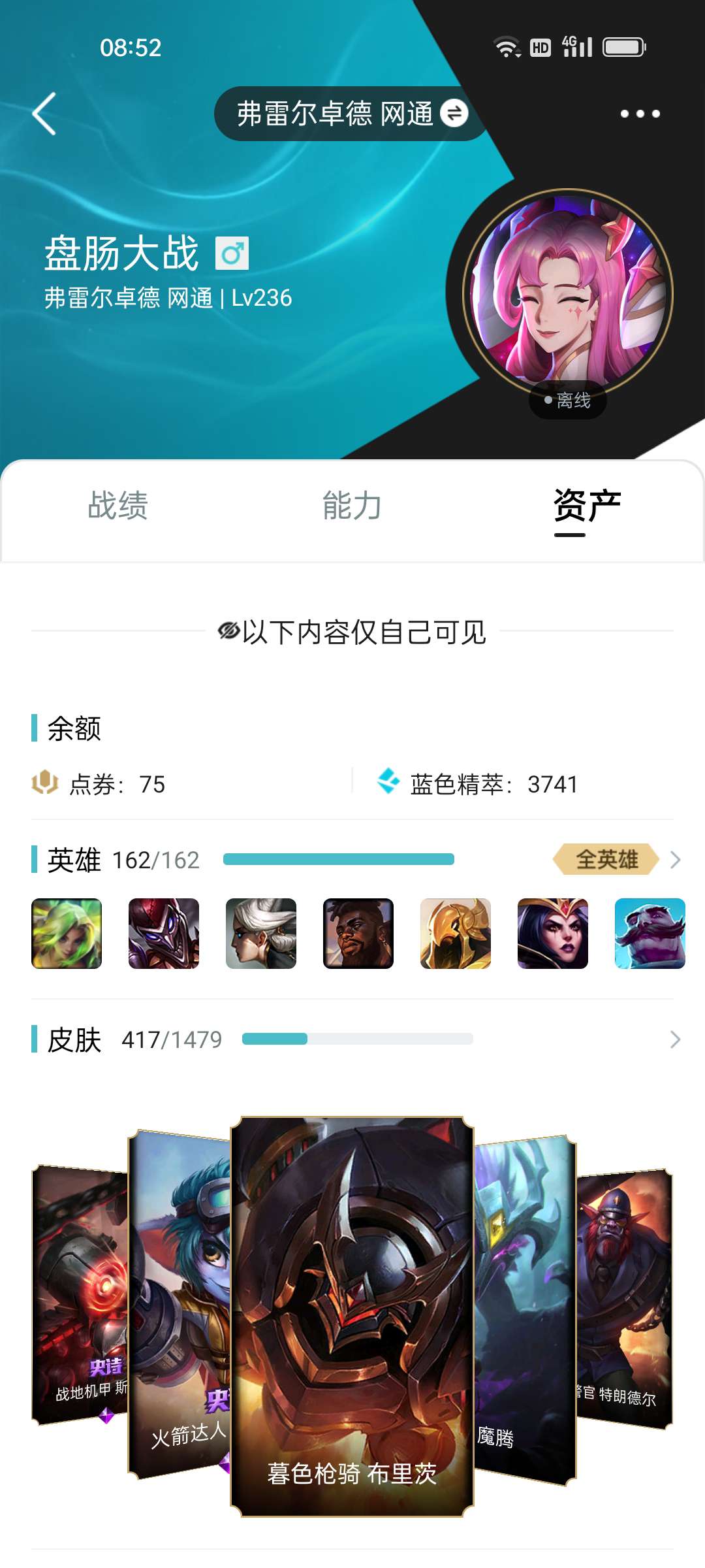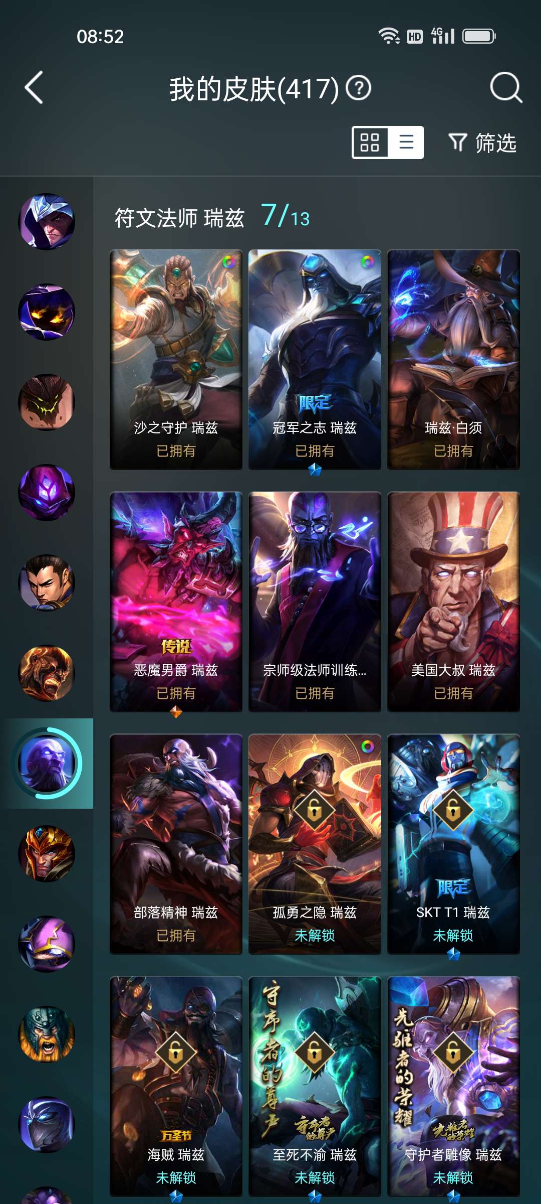 装备描述:全英雄449皮肤100多各种稀有限定中单上单皮肤多 至臻男刀卡莎石头人海克斯蚂蚱情人节乌鸦万圣节梦魇人马至高天新英雄和维古斯野兽猎人有很多最新中单上单很多英雄都有7个皮肤以上具体看号