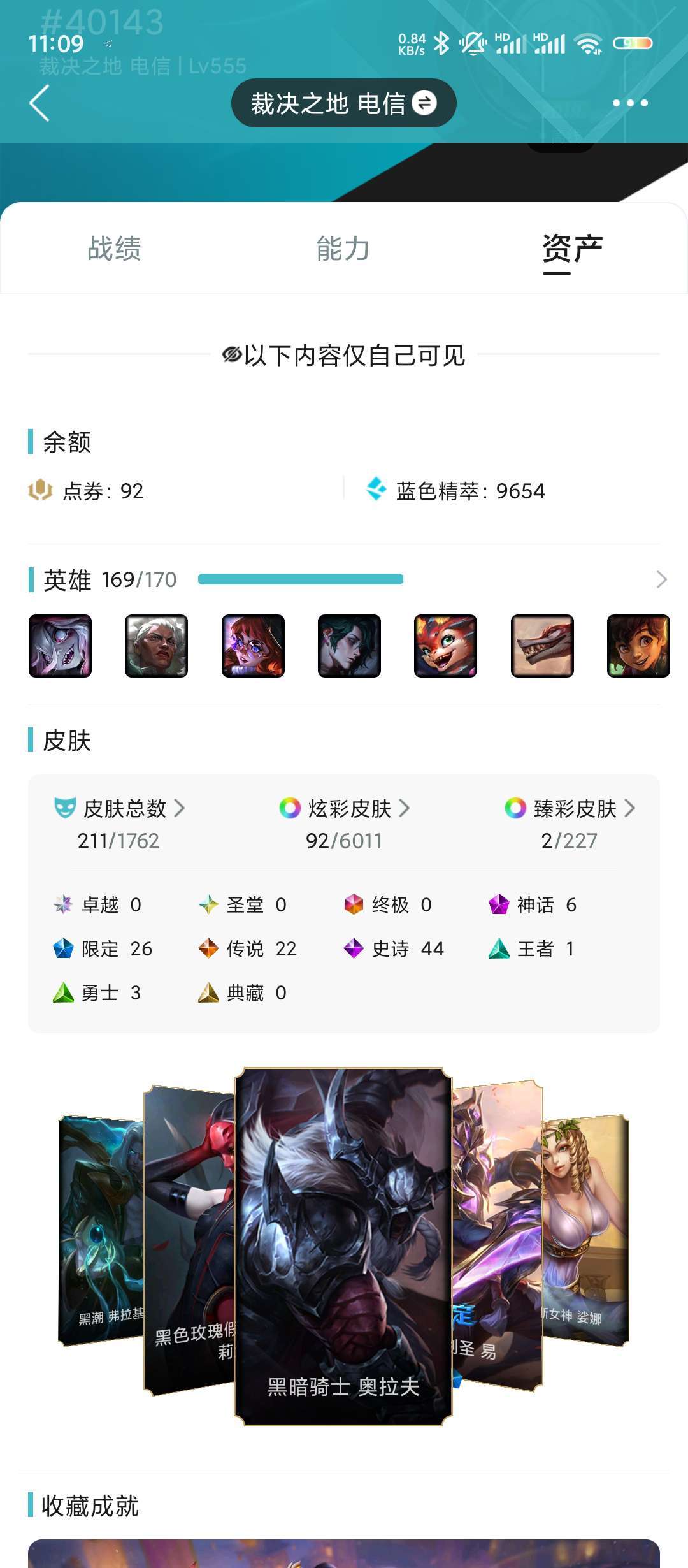 装备描述:全英雄211个皮肤,女帝卡特,黑夜亚索,未来战士和御剑锐雯,吕布皇子,星守金克斯,kda阿卡丽