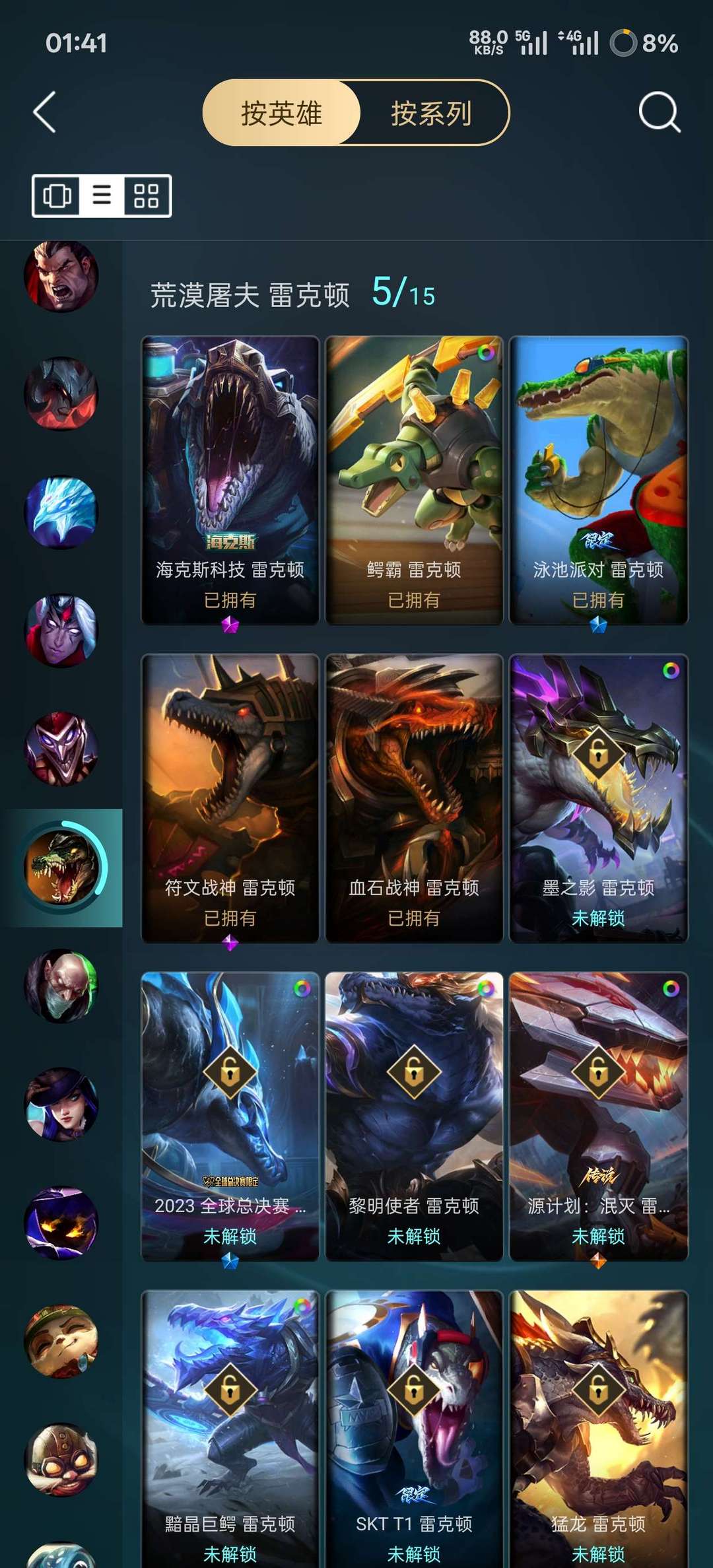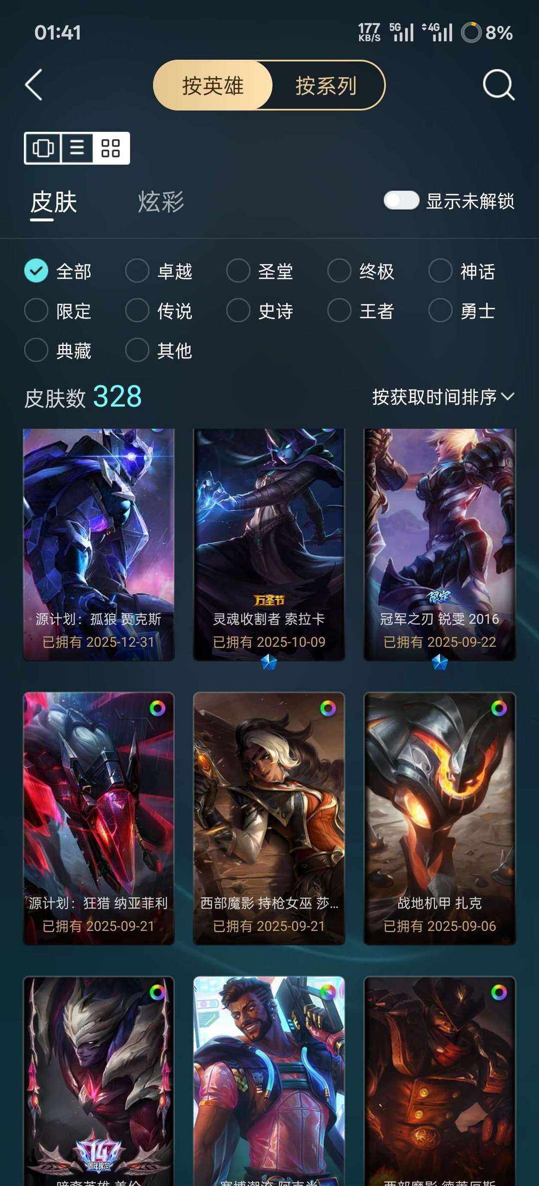 三百多皮肤,基本每个英雄都有皮肤,至臻塞拉斯,霸天剑魔,大元素师拉克丝。多个战队皮肤。开黑带妹必备。