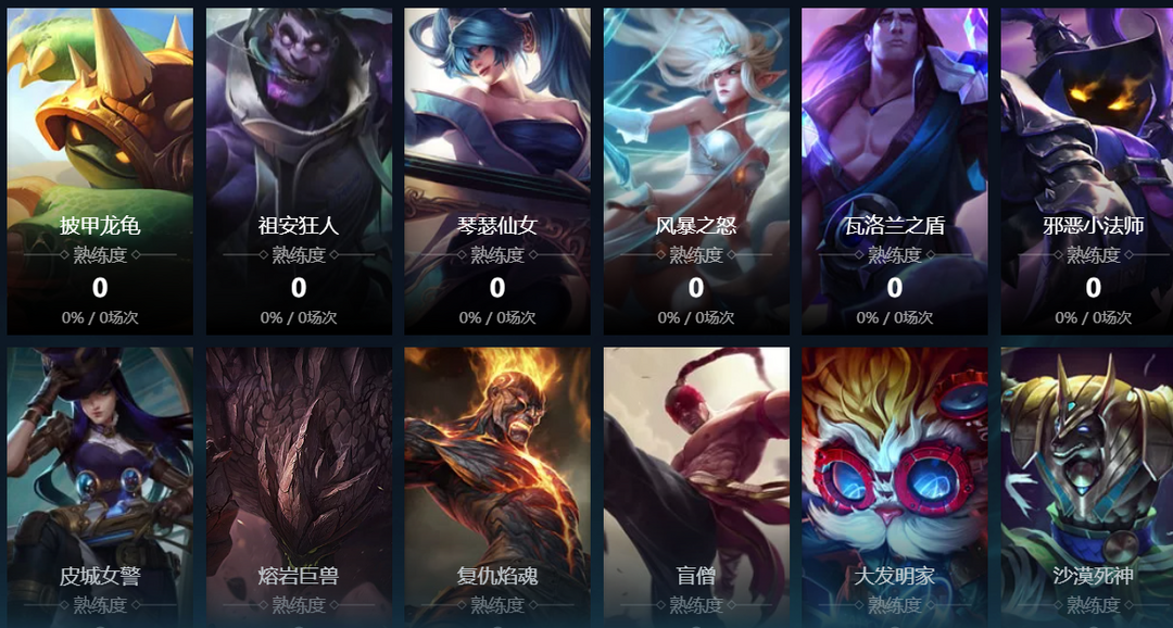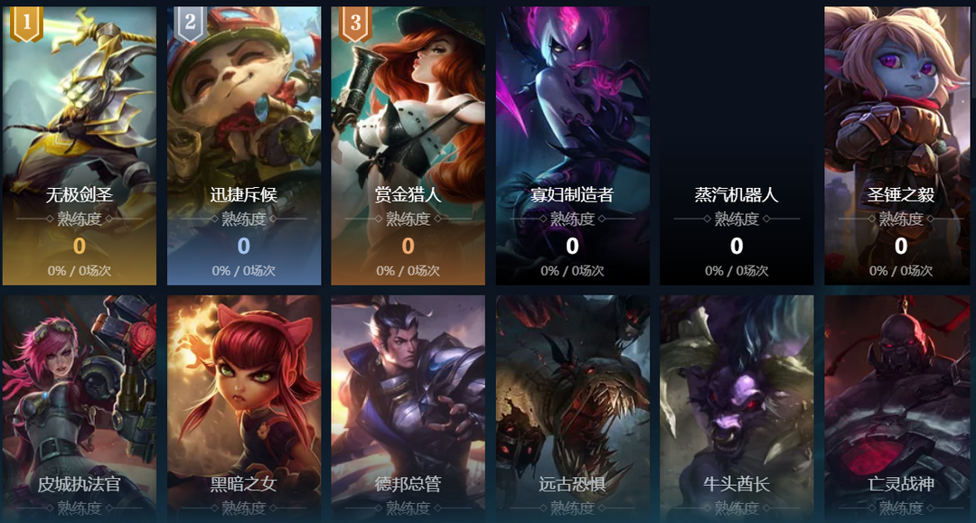寒冰射手;迅捷斥候;复仇焰魂;熔岩巨兽;沙漠死神;黑暗之女;德邦总管;远古恐惧;无极剑圣;牛头酋长;