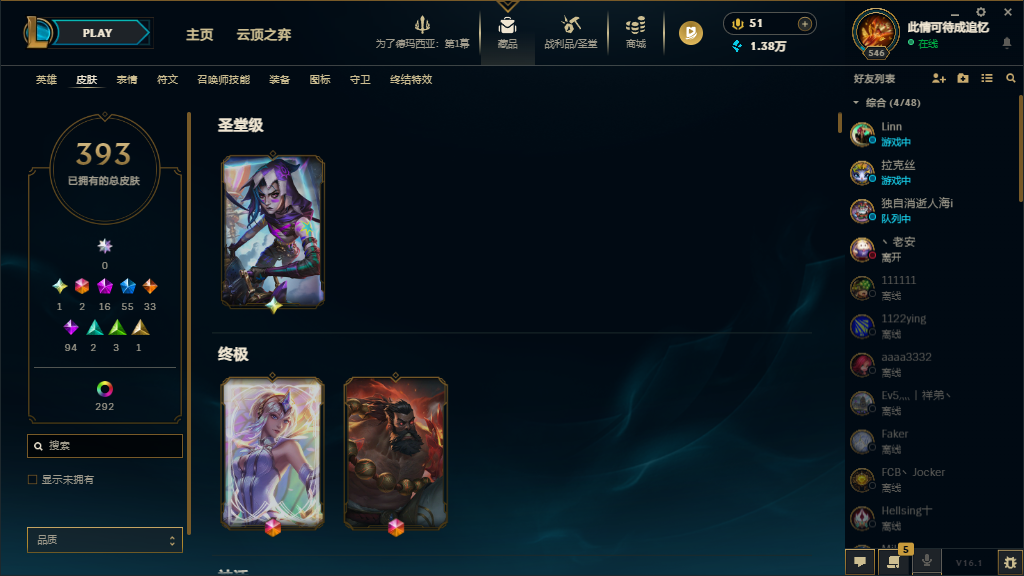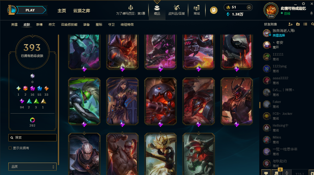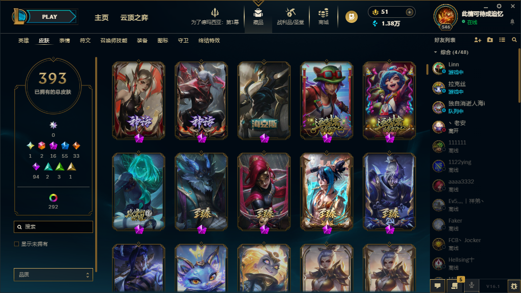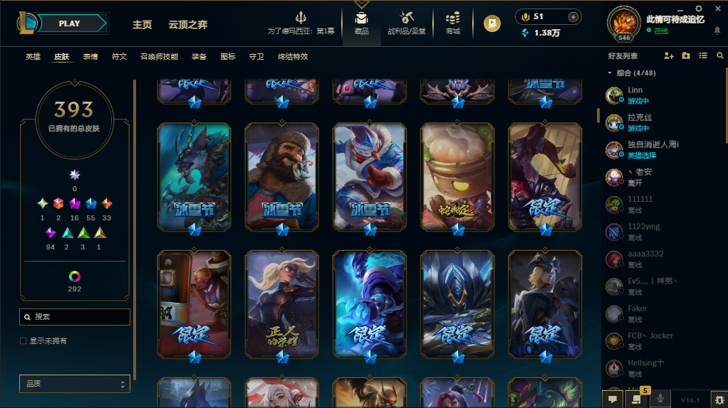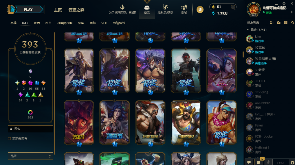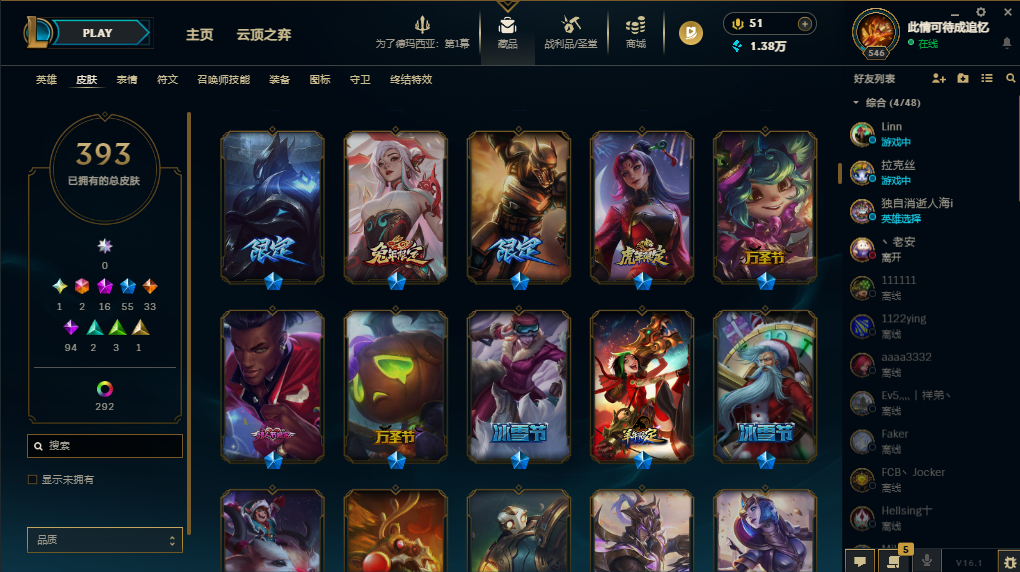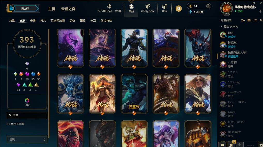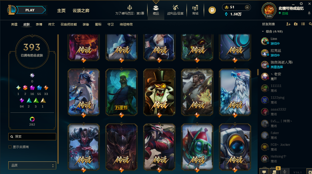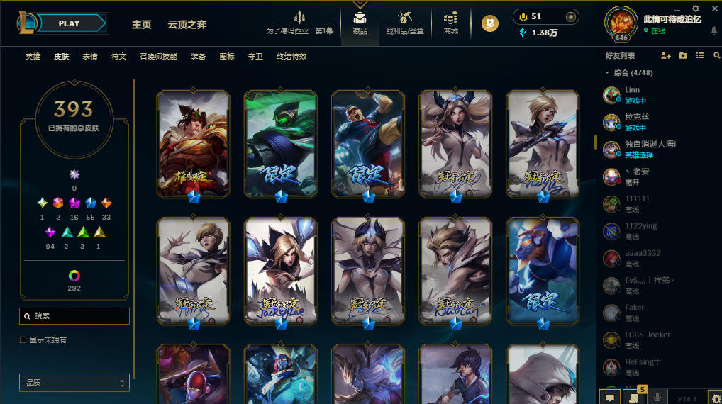 装备描述:基本每个英雄都有可用皮肤,上赛季大师,禁挂机禁逃跑