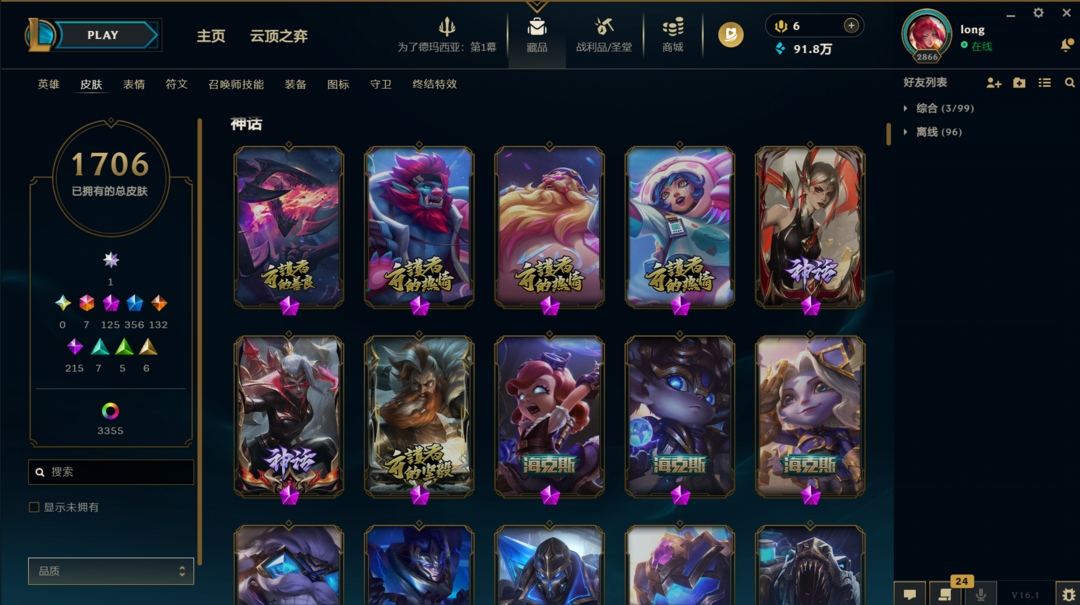 联盟二区丨可排位丨1706原皮丨3392炫彩丨臻彩丨神话丨至臻