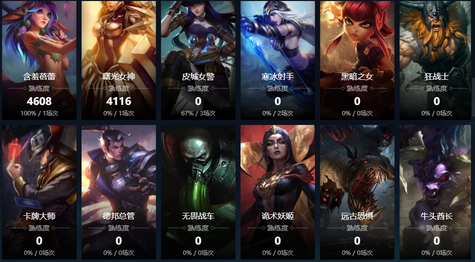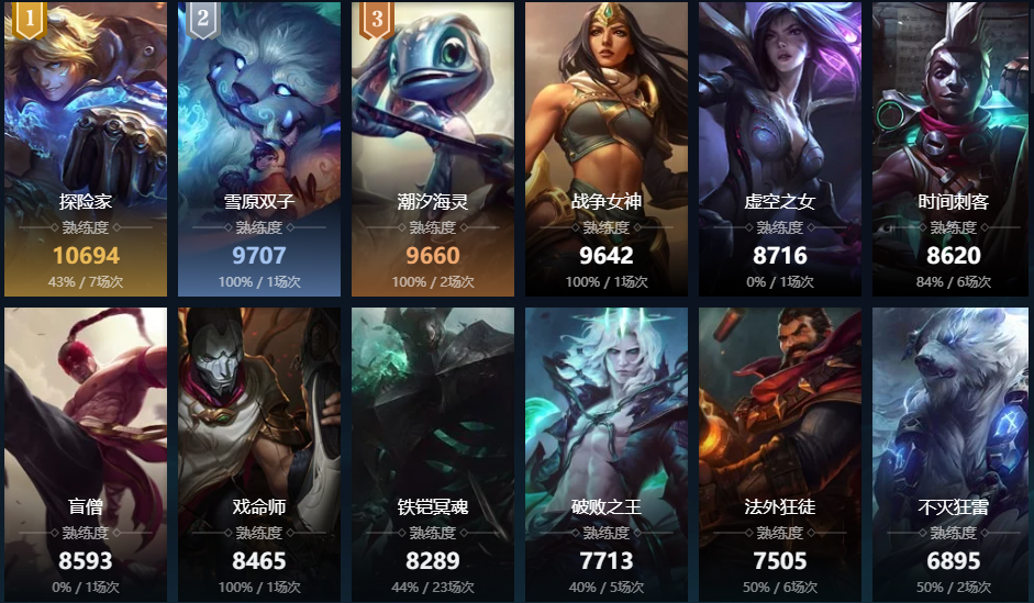 残月之肃;蛮族之王;德邦总管;破败之王;寒冰射手;赏金猎人;皮城女警;暴走萝莉;战争女神;麦林炮手;