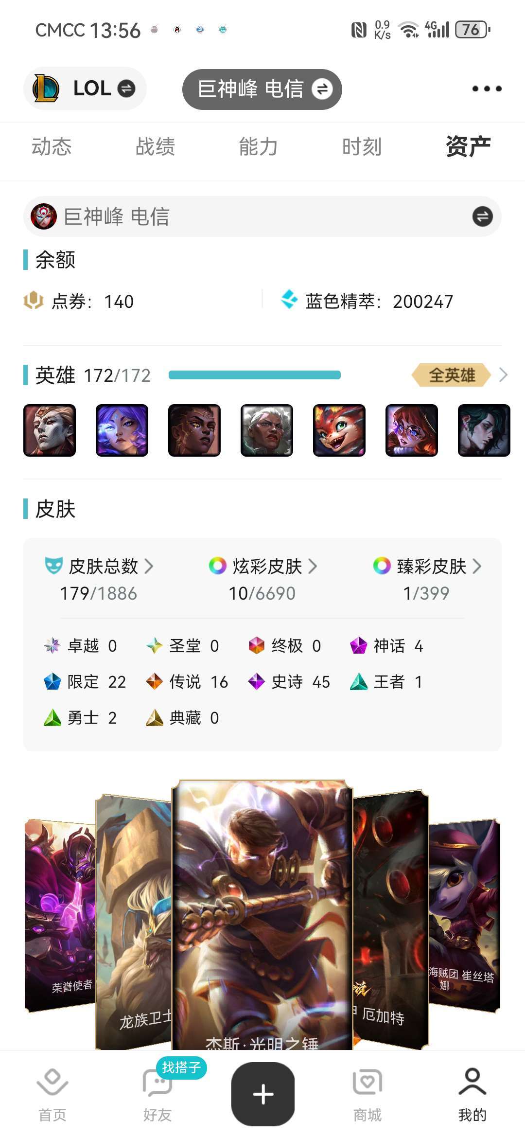 装备描述:大乱斗 匹配 排位随便你玩180左右个皮肤全英雄