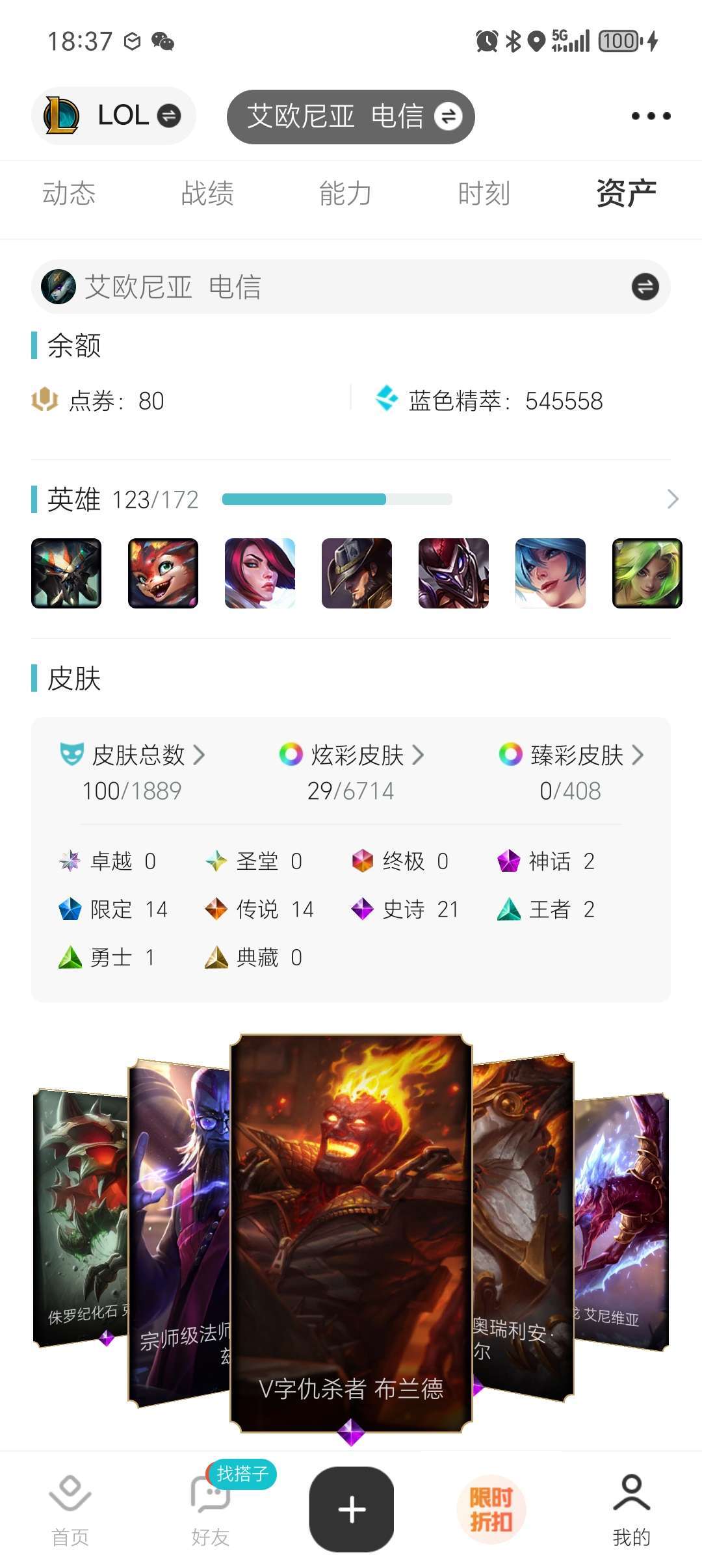 这个号之前基本都是我自己在玩,等级700多吧,皮肤打野英雄蛮多,还有AD,金币随便用,足以把英雄买完