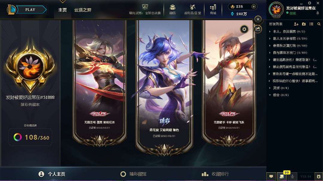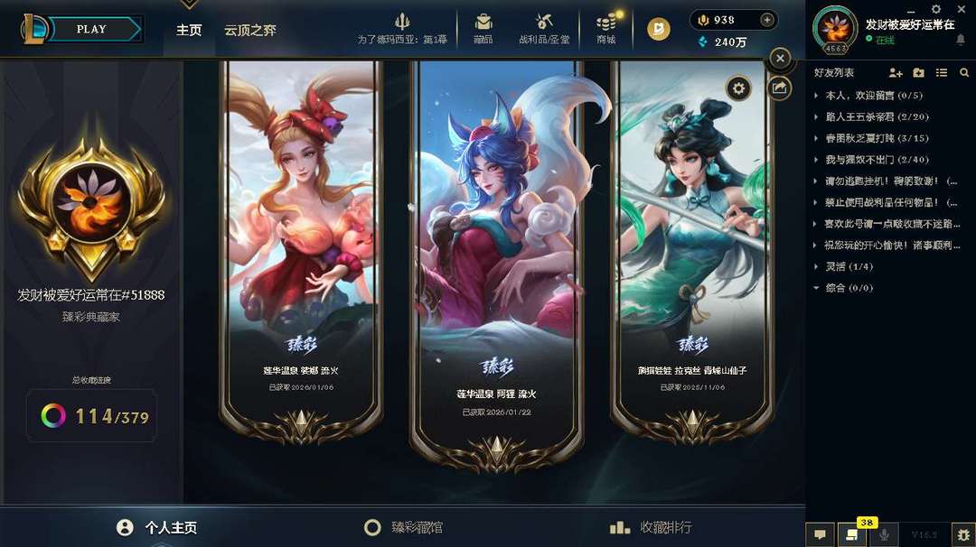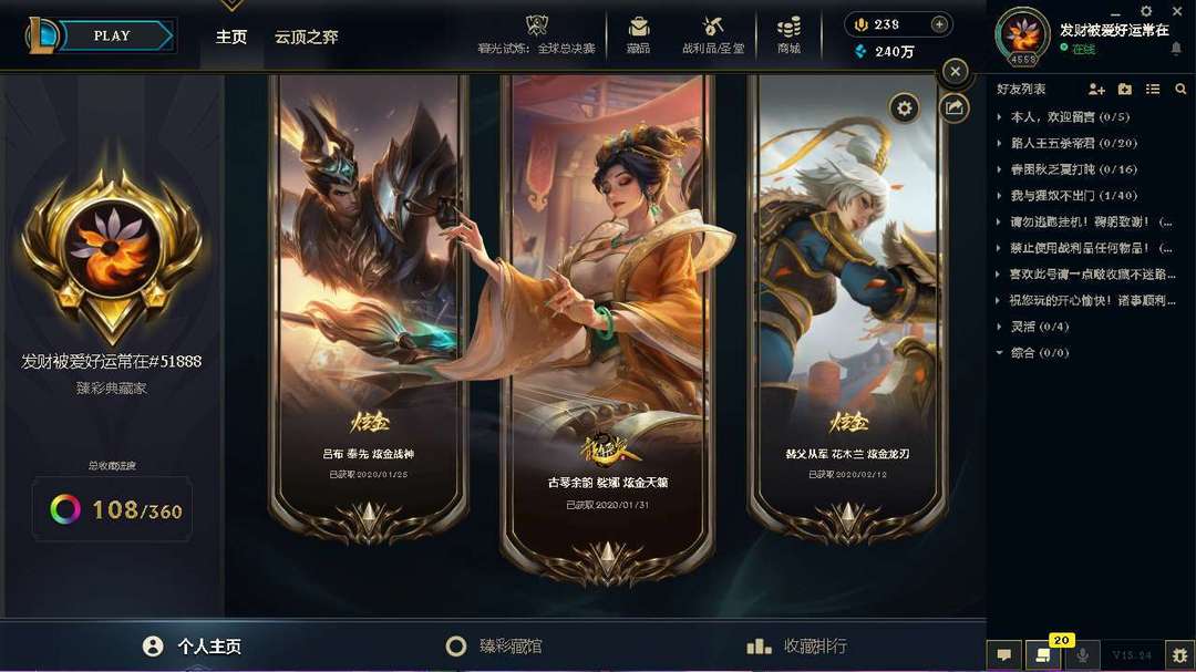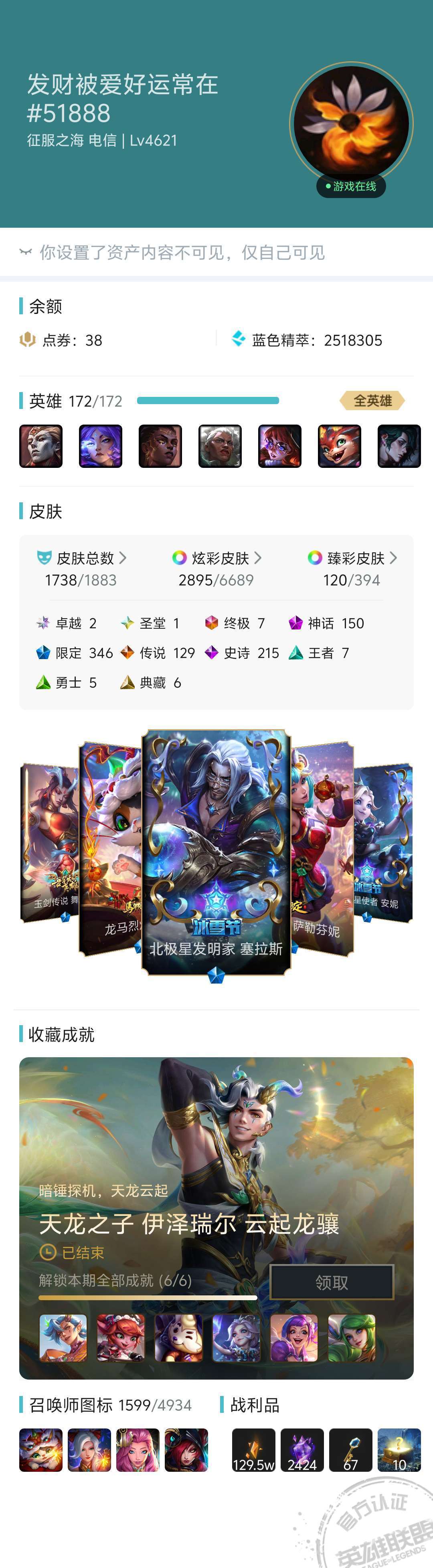 4635皮肤成就宗师第3名平台唯一三届最强王者❤️全至臻海克斯龙虎兔年❤️神话年限限定莲花摄魂金蛇