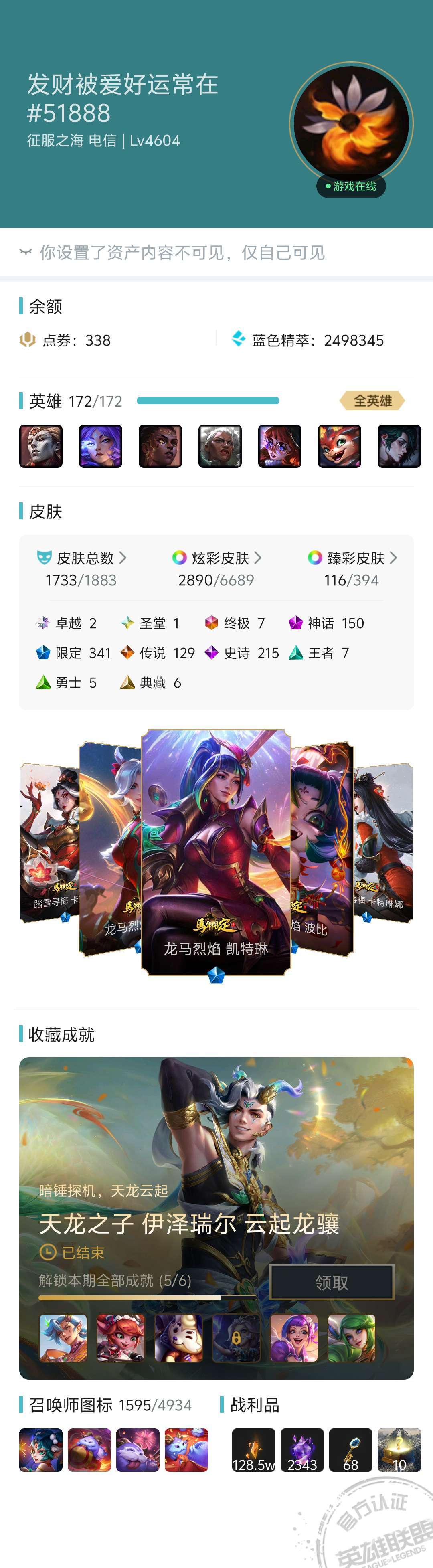 装备描述:禁止乱斗!可海斗!负率低分妹子号臻彩120❤️龙马烈焰❤️踏雪寻梅 ❤️莲花之令卡尔玛,金蛇巨星,摄魂使者薇恩,恐惧新星诺手,庆典女皇,青年瑞兹,奥斯曼大帝船长,斩星魔剑,穿星魔锋,哥特萝莉,梦游仙境,舞会公主安妮。LPL十周年卡莎,薇恩,猪妹炫金!年限,冠军凯旋炫金全!末日人机炫全/EDG冠军臻彩全/青城山仙子❤️ 本平台唯一《奖池清空;原皮过千;炫彩过千;等级过千(4500级区榜第1名)成就段位:宗师红宝石段位第3名!超凡大师S13,S12三届最强王者S11,S10,S9;永久峡谷之巅标志》全英雄超多至臻神话海克斯年限周年限定传说皮肤妹子号《有→最强王者头像图标,最强王者奇亚娜,永恩,加里奥表情,胜利枪神 卢锡安限定最强王者炫彩皮肤等标志!绝版燃烧之花头像图标!》 请勿逃跑挂机感谢合作!逃跑挂机拉入黑名单! 小本生意,薄利多销;经济实惠,物美价廉!还望诸君多多帮衬!喜欢此号请→【点啵收藏不迷路!】祝您玩的开心愉快!诸事顺利! 【特别注意:素质游戏该账户对于故意逃跑,挂机,谩骂;恶意制造裁决之镰!恶意使用资产点券,神话精萃,蓝色精粹,橙色精粹及战利品任何物品!违规拉入黑名单!】