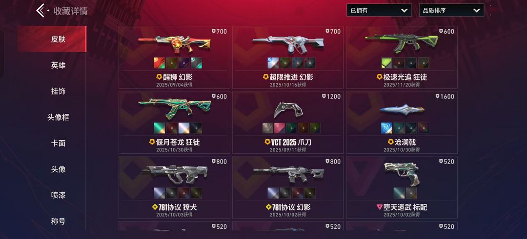 24级收藏家VCT2025爪刀 超限推进幻影 醒狮幻影 极速光追狂徒 偃月苍龙狂徒 极速光追狂徒