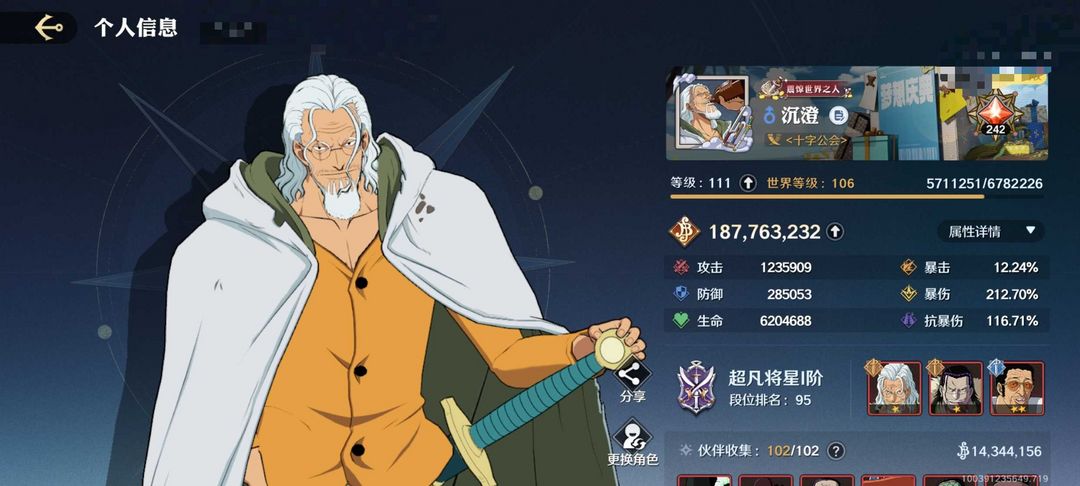 冥王雷利❤️顶上老沙❤️全角色全信物全时装❤️ 102伙伴20红❤️1.8亿赏金❤️全奥义❤️39区