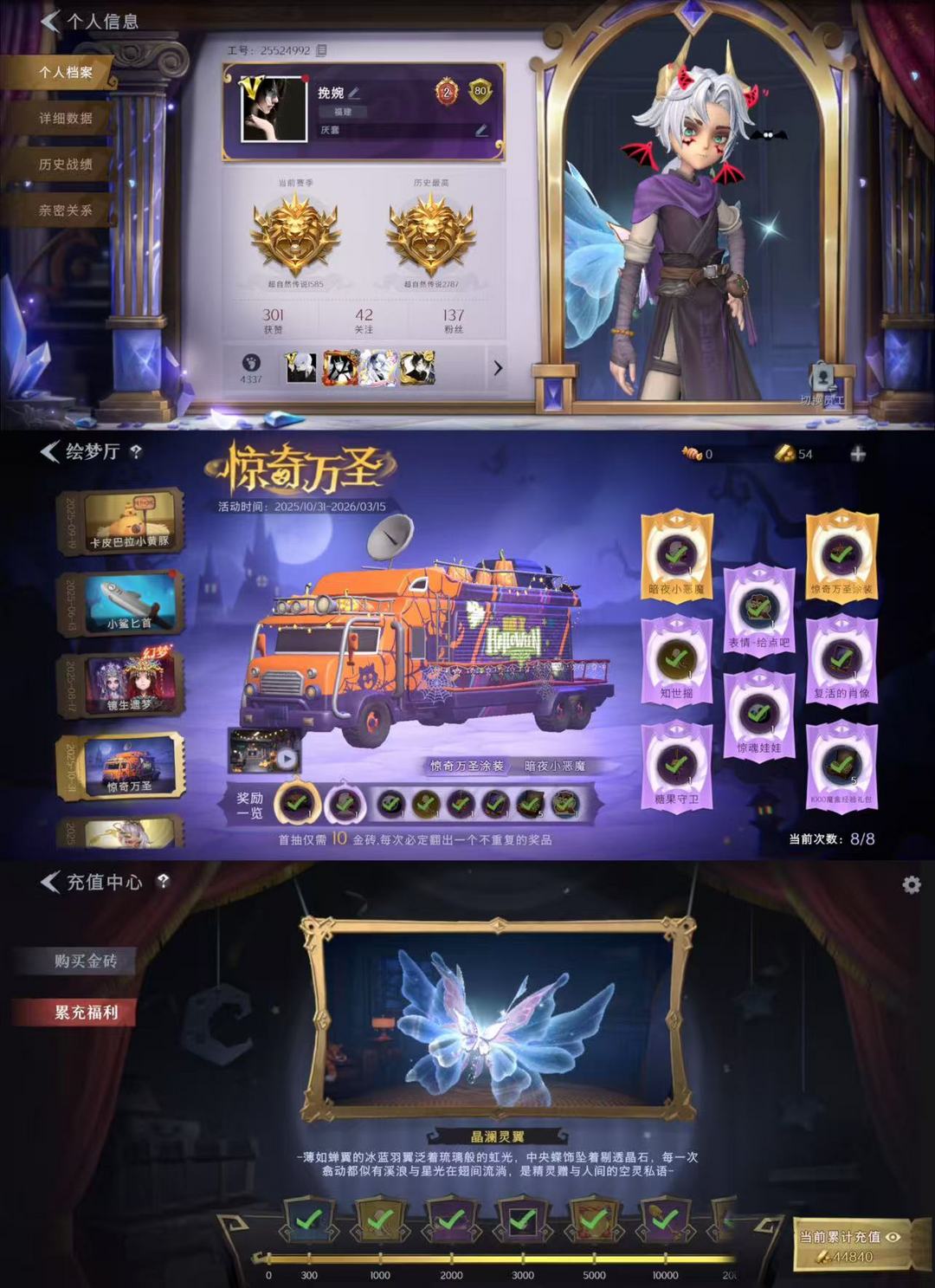 id挽婉⭐1红5金26紫⭐金色蜜蜂线索⭐历史2800星⭐满氪晶澜灵翼⭐惊奇万圣车皮/妆容⭐赞梦露比全