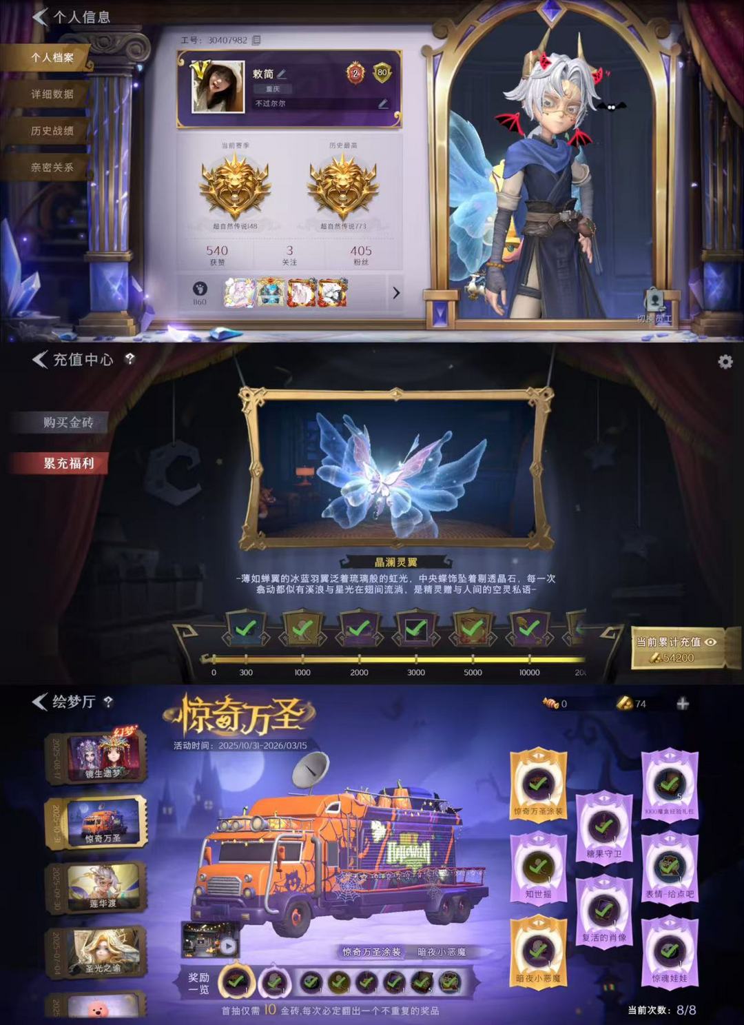限制: 撤单率<50%才可租用此帐号装备描述:【幻梦皮肤1】镜生遗梦 【金色皮肤5】莲华渡、圣光之谕、血色中的玛丽、遗失的童话、镜花辞 【紫色皮肤26】搬开山、仙锋小姐、甜梦派对、绒绒对决、莓果陷阱、异色序曲、迷途僵宝、除妖小师妹、赤炼将军、黑月挽歌、青丘一梦、王子与骑士、情公主、水王子、冰公主、罗丽、白光莹、泽引山海、灵昭鹿鸣、瑞羽衔春、霓裳踏雪、青云逸歌、素影瑶光、丝缕哀歌、绣春逍影、呱呱雨衣 【道具皮肤】晶澜灵翼、青瓷、紫霄、珍珠芭乐莓莓、昆仑镜、圣心之泪、青玉抱丹、凤鸣九天、绯红柴郡猫、鸣沙鼓、蔷薇物语、云端梦想计划、赤色之刃、小鲨匕首、祝祷词、最后的独角兽、弦外之音、龙鳞、宝剑八、永眠曲、飞花令、心跳眼镜、赞萌露比水枪、星光的裁决、碧络琅环、伏妖塔、幻宠之门、甜蜜泡泡枪、紫气东来、焰骨、小狗蛇点点鞭、金丝眼镜、乘风溯雪、卡皮巴拉小黄豚铲、赞萌波板糖、惊魂娃娃、月下莲台、花落精绝、渡鸦公爵、飞天绫、新星时代、蜜蜂线索、兜风日程、寻凉记、班卓琴、晚安仪式、潮汐小海兔、梵音莲华、兔先生的时钟、云梦之星、天使的呼唤、蝶恋花、毛球夹子、在逃小新娘、鼠鼠小跟班 【美妆】暗夜小恶魔【载具】惊奇万圣涂装