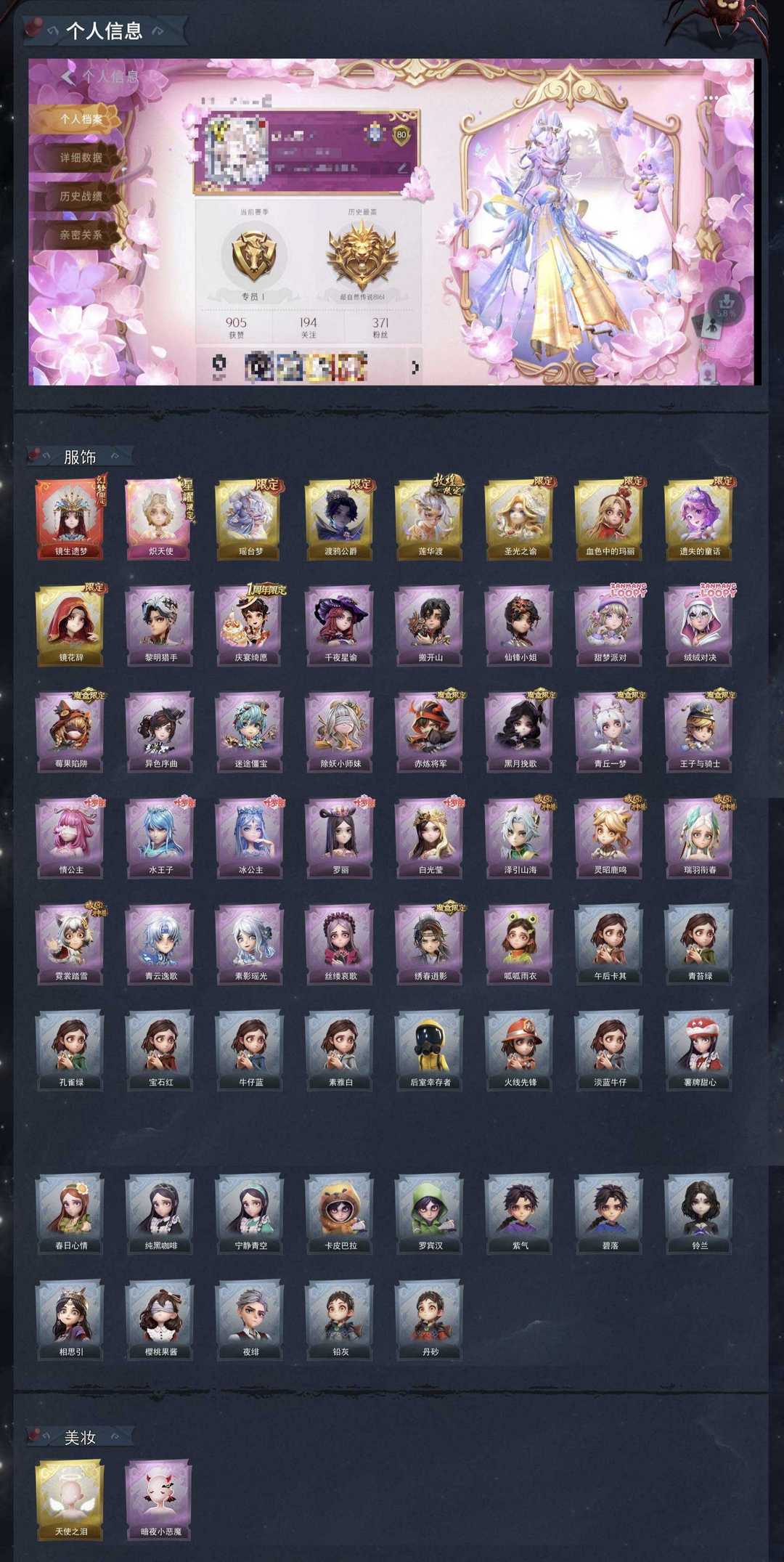 限制: 租号5次及以上 | 撤单率<30%才可租用此帐号装备描述:❗已设置二级密码(不设也会被个别租客设置),无法出售金色回收物(金色以下可以卖),如果币不够可以把金给队友让队友买装备,介意勿下单 ⭐可以叫号主上号卖东西:游戏内搜索 拾趣,看个性签名,长租可以给二级密码 安卓ios均可登录,恶意撤单、改id、恶意发言等不文明行为永久拉黑 ✨一单一密保证中途不会挤号,祝游戏愉快~ ⚠️禁止使用外挂、恶意发言、用号行骗,若因此类行为导致禁言、封号的,平台提取租客实名地址,必定会立案追责,并根据账号价值全额赔偿。 账号情况: 1星耀炽天使/1幻梦镜生遗梦 6金皮:血色中的玛丽/遗失的童话/圣光之谕/莲华渡/镜花辞/渡鸦公爵 s1-s7魔盒:青丘一梦 赤炼将军 黑月挽歌 王子与骑士 绣春逍影 莓果陷阱 黎明猎手 有内测套 原始股东头像框 和 龙傲天头套 故宫(瑞羽衔春 泽引山海 霓裳踏雪 灵昭鹿鸣) 青花瓷(素影瑶光 青云逸歌) 叶罗丽(情公主 冰公主 白光莹 罗丽 水王子) 捉妖奇妙夜(迷途僵宝 除妖小师妹) 露比联动时装(绒绒对决 甜梦派对) 非遗傩戏:搬开山 先锋小姐 异色序曲/呱呱雨衣/丝缕哀歌