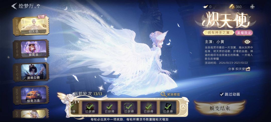 全皮肤✨满抽莉莉瑶台梦✨小黄炽天使满抽✨2红7金30紫✨零渡鸦公爵✨大翅膀✨赤炼将军✨8300氪条
