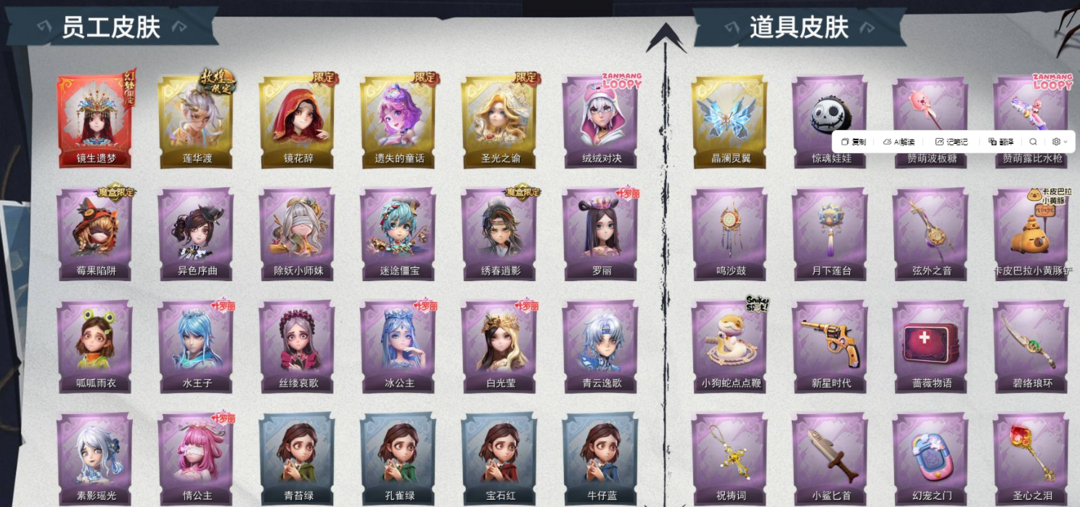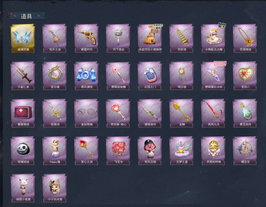 装备描述:【段位】超自然传说 【幻梦皮肤数量】1 【金色皮肤数量】4 【紫色皮肤数量】15 【道具皮肤数量】34 【累充】39240金砖 【赛季魔盒】普通魔盒 【员工】小黄、爱丽丝、零、阿念、逍遥、薇薇安、巫铃儿、莉莉、艾伦、爱德华、兰 【幻梦皮肤】巫铃儿-镜生遗梦 【金色皮肤】逍遥-莲华渡、薇薇安-圣光之谕、小黄-遗失的童话、巫铃儿-镜花辞 【紫色皮肤】艾伦-绒绒对决、莉莉-莓果陷阱、小黄-异色序曲、阿念-迷途僵宝、莉莉-除妖小师妹、莉莉-情公主、艾伦-水王子、爱丽丝-冰公主、小黄-罗丽、薇薇安-白光莹、零-青云逸歌、巫铃儿-素影瑶光、爱丽丝-丝缕哀歌、逍遥-绣春逍影、小黄-呱呱雨衣 【道具皮肤】喷气背包-晶澜灵翼、除颤仪-弦外之音、转轮手枪-新星时代、腰包-月下莲台、铲子-卡皮巴拉小黄豚铲、葫芦-伏妖塔、长鞭-小狗蛇点点鞭、摸金符-花落精绝、刺刀-小鲨匕首、传送按钮-昆仑镜、喷气背包-乘风溯雪、铲子-赞萌波板糖、传送按钮-幻宠之门、音响-鸣沙鼓、短管猎枪-赞萌露比水枪、腰包-宝剑八、急救包-蔷薇物语、摸金符-祝祷词、夜视仪-金丝眼镜、刺刀-碧络琅环、铲子-龙鳞、桃木剑-凤鸣九天、黄牛能量饮料