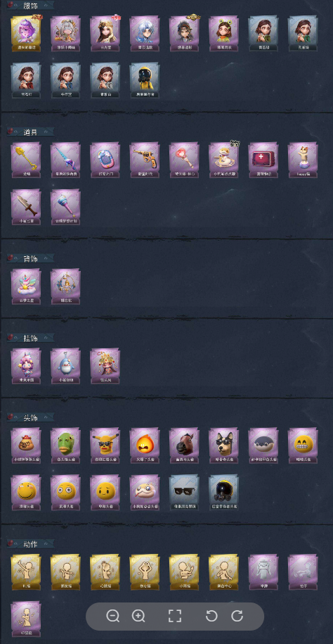 装备描述:【员工】小黄、爱丽丝、零、阿念、逍遥、薇薇安、巫铃儿、莉莉、艾伦、爱德华、兰 【金色皮肤】小黄-遗失的童话 【紫色皮肤】莉莉-除妖小师妹、薇薇安-白光莹、零-青云逸歌、逍遥-绣春逍影、小黄-呱呱雨衣 【道具皮肤】铲子-龙鳞、桃木剑-最后的独角兽、传送按钮-幻宠之门、转轮手枪-新星时代、长鞭-小狗蛇点点鞭、急救包-蔷薇物语、音响-happy猫、刺刀-小鲨匕首、专业手电-云端梦想计划 【头饰】小财神豚豚头套、鱼头怪头套、烈焰红唇头套、火爆了头套、面具马头套、哈士奇头套、萨卡班甲鱼头套、嘻嘻头套、滑稽头套、呆滞头套、卑微头套、小狗蛇点点头套、像素朋克墨镜、后室幸存者头套 【背饰】云梦之星、蝶恋花 【挂饰】未竟乐园、小鲨包包、钗头凤 【动作】DL摇、鹏友摇、心跳摇、伤心摇、小雨摇、舞台中心、举牌、抬手、KT猫摇