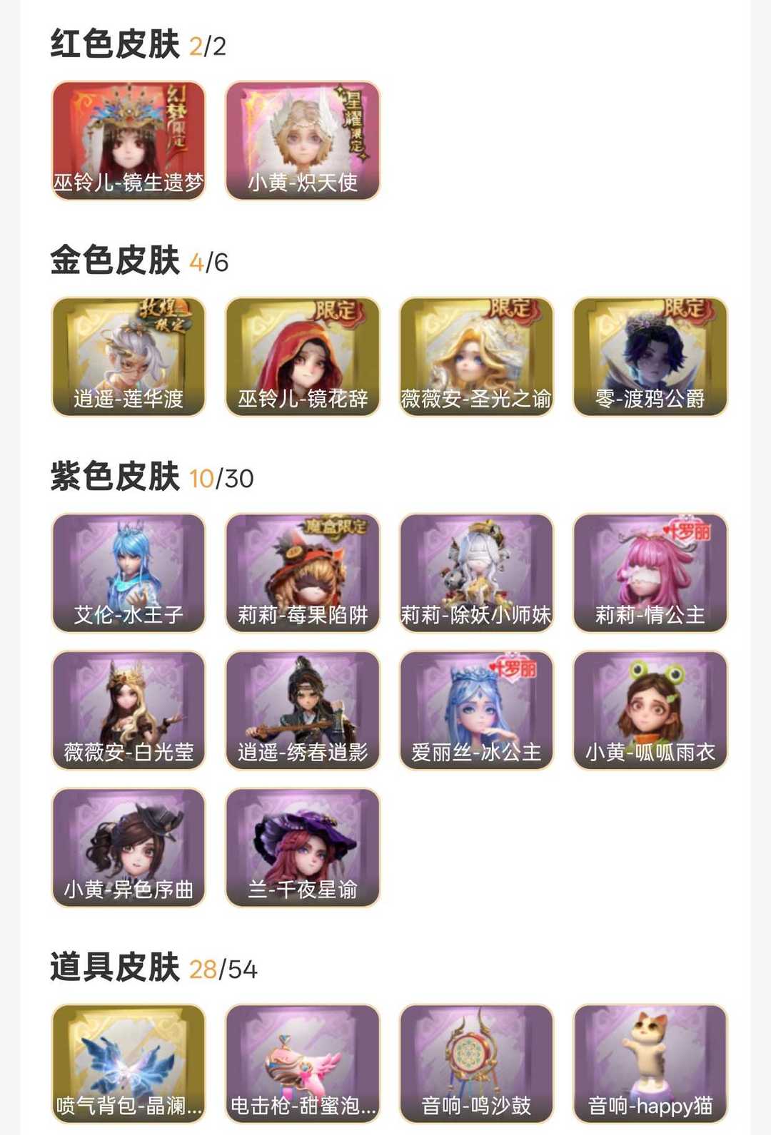 装备描述:标题【免二级或者支持自己卖回收物】 可以自己卖回收物也可以关注游戏好友 关注不会满 会自动清理关注 小黄-炽天使,巫铃儿-镜生遗梦,巫铃儿-镜花辞,逍遥-莲华渡,薇薇安-圣光之谕,零-渡鸦公爵,莉莉-情公主,兰-千夜星谕,艾伦-水王子,爱丽丝-冰公主,薇薇安-白光莹,小黄-呱呱雨衣,逍遥-绣春逍影,小黄-异色序曲,莉莉-莓果陷阱,莉莉-除妖小师妹;道具:喷气背包-晶澜灵翼,音响-happy猫,刺刀-铂刺与红萼,刺刀-小鲨匕首,铲子-圣心之泪,音响-冬夜暖忆,电击枪-甜蜜泡泡枪,葫芦-伏妖塔,长鞭-小狗蛇点点鞭,桃木剑-凤鸣九天,桃木剑-绯色遗证,急救包-末章心跳,铲子-龙鳞,长枪-罪棘,腰包-惊魂娃娃,摸金符-祝祷词,传送按钮-昆仑镜,额外的背包-飞花令,夜视仪-金丝眼镜,黄牛能量饮料-青玉抱丹,铲子-撒拉弗的祷告,刺刀-碧络琅环,传送按钮-逆时审判,摸金符-紫霄,长鞭-飞天绫,腰包-宝剑八,急救包-土拨鼠捏捏,音响-鸣沙鼓;美妆:美妆-天使之泪,美妆-暗夜小恶魔;饰品:头饰-滑稽头套,头饰-火爆了头套,头饰-卑微头套,头饰-萨卡班甲鱼头套,头饰-鱼头怪头套,头饰-呆滞头套,头饰-