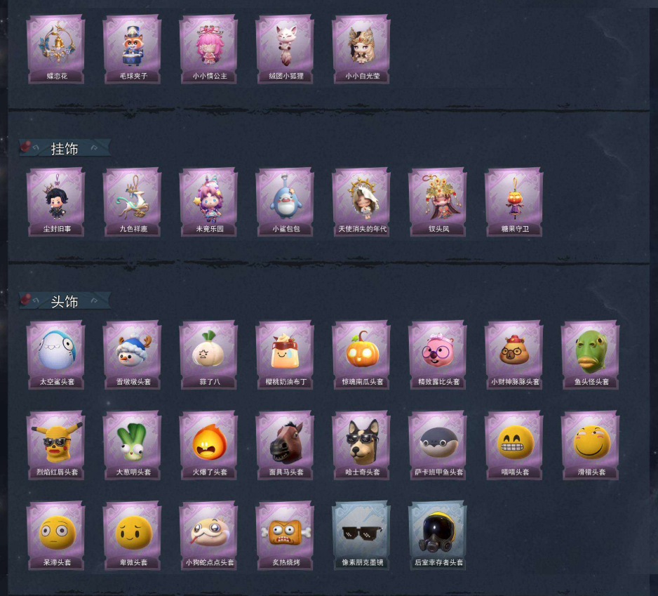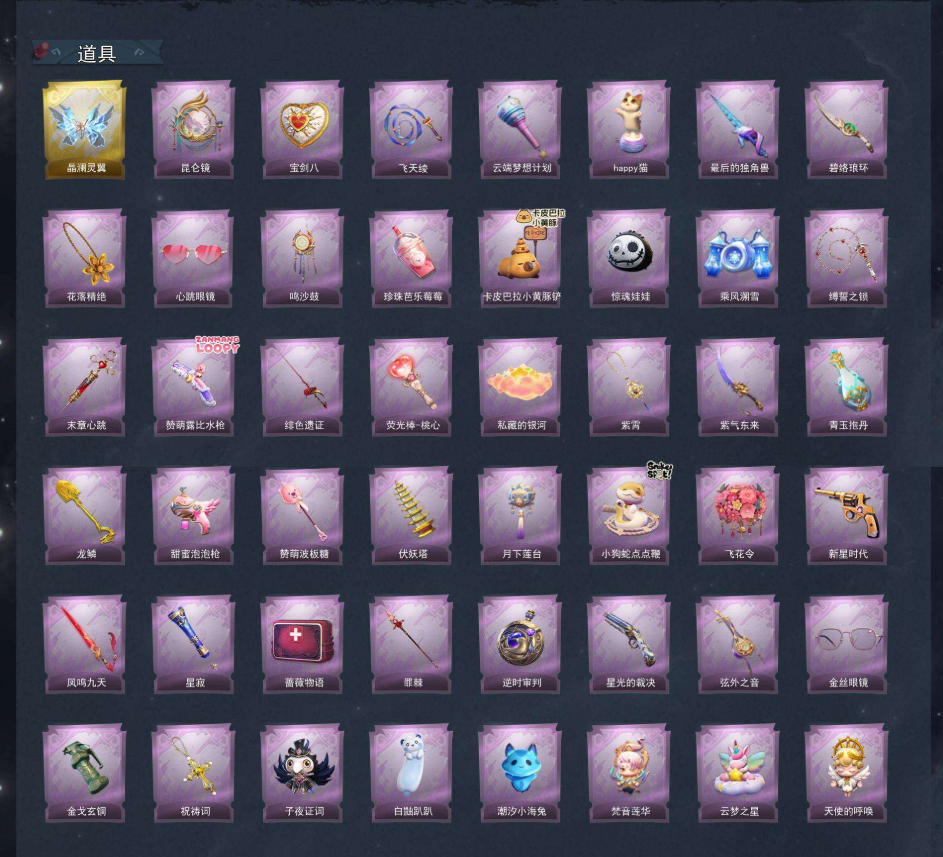 装备描述:【幻梦皮肤】巫铃儿-镜生遗梦 【金色皮肤】零-渡鸦公爵、逍遥-莲华渡、薇薇安-圣光之谕、小黄-遗失的童话、巫铃儿-镜花辞 【紫色皮肤】艾伦-黎明猎手、兰-千夜星谕、薇薇安-仙锋小姐、爱丽丝-甜梦派对、莉莉-莓果陷阱、阿念-迷途僵宝、莉莉-除妖小师妹、阿念-王子与骑士、莉莉-情公主、艾伦-水王子、爱丽丝-冰公主、小黄-罗丽、薇薇安-白光莹、逍遥-泽引山海、阿念-灵昭鹿鸣、爱丽丝-瑞羽衔春、小黄-霓裳踏雪、零-青云逸歌、巫铃儿-素影瑶光、爱丽丝-丝缕哀歌、逍遥-绣春逍影、小黄-呱呱雨衣 【道具皮肤】喷气背包-晶澜灵翼、传送按钮-昆仑镜、腰包-宝剑八、长鞭-飞天绫、专业手电-云端梦想计划、音响-happy猫、桃木剑-最后的独角兽、刺刀-碧络琅环、摸金符-花落精绝、夜视仪-心跳眼镜、音响-鸣沙鼓、黄牛能量饮料-珍珠芭乐莓莓、铲子-卡皮巴拉小黄豚铲、腰包-惊魂娃娃、喷气背包-乘风溯雪、长鞭-缚誓之锁、急救包-末章心跳、短管猎枪-赞萌露比水枪、桃木剑-绯色遗证、腰包-私藏的银河、摸金符-紫霄、刺刀-紫气东来、黄牛能量饮料-青玉抱丹、铲子-龙鳞、电击枪-甜蜜泡泡枪、铲子-赞萌波板糖、葫芦-伏妖塔、腰