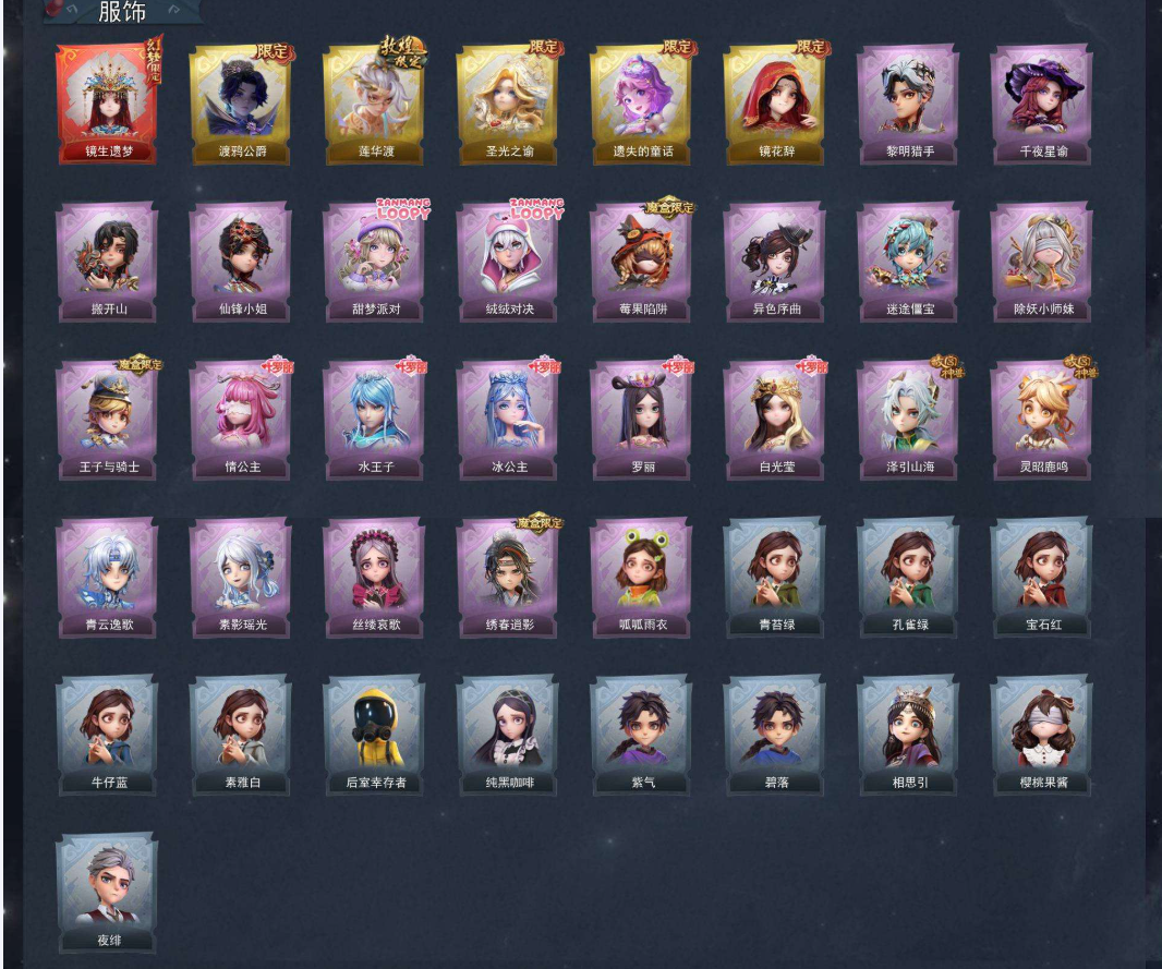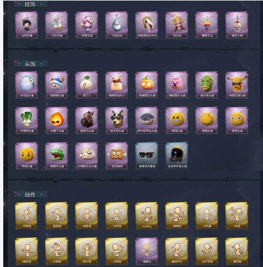 装备描述:兔宝2月14号到期【幻梦皮肤】巫铃儿-镜生遗梦 【金色皮肤】零-渡鸦公爵、逍遥-莲华渡、薇薇安-圣光之谕、小黄-遗失的童话、巫铃儿-镜花辞 【紫色皮肤】艾伦-黎明猎手、兰-千夜星谕、零-搬开山、薇薇安-仙锋小姐、爱丽丝-甜梦派对、艾伦-绒绒对决、莉莉-莓果陷阱、小黄-异色序曲、阿念-迷途僵宝、莉莉-除妖小师妹、阿念-王子与骑士、莉莉-情公主、艾伦-水王子、爱丽丝-冰公主、小黄-罗丽、薇薇安-白光莹、逍遥-泽引山海、阿念-灵昭鹿鸣、零-青云逸歌、巫铃儿-素影瑶光、爱丽丝-丝缕哀歌、逍遥-绣春逍影、小黄-呱呱雨衣 【道具皮肤】喷气背包-晶澜灵翼、音响-鸣沙鼓、除颤仪-弦外之音、专业手电-星寂、电击枪-甜蜜泡泡枪、刺刀-紫气东来、黄牛能量饮料-青玉抱丹、专业手电-云端梦想计划、葫芦-伏妖塔、黄牛能量饮料-雪顶奇愿、传送按钮-昆仑镜、铲子-赞萌波板糖、转轮手枪-新星时代、音响-happy猫、喷气背包-乘风溯雪、急救包-土拨鼠捏捏、长鞭-小狗蛇点点鞭、摸金符-祝祷词、桃木剑-绯色遗证、额外的背包-飞花令、长鞭-缚誓之锁、桃木剑-最后的独角兽、腰包-宝剑八、桃木剑-凤鸣九天、短管猎枪-星光的裁决、