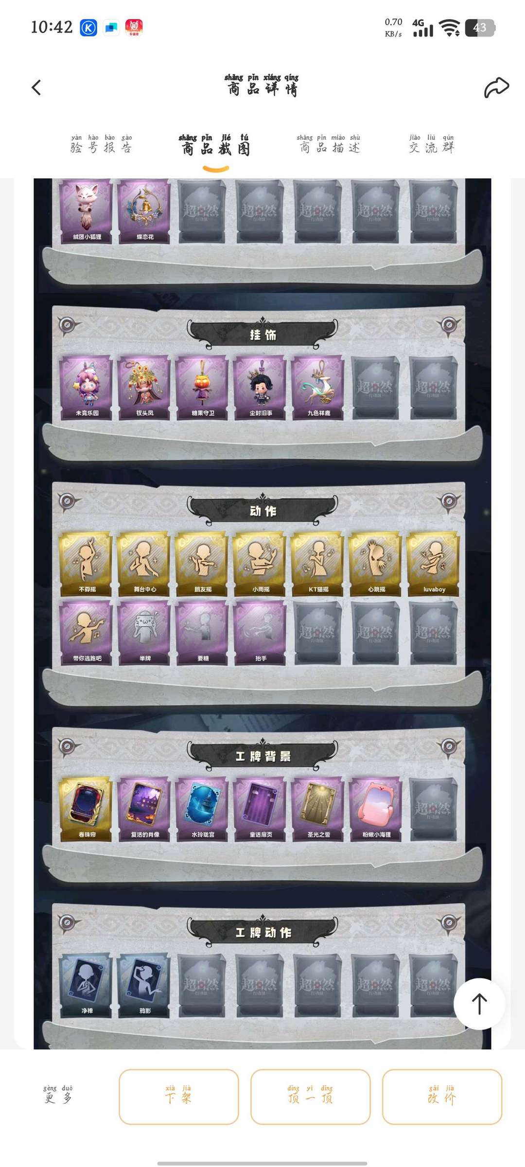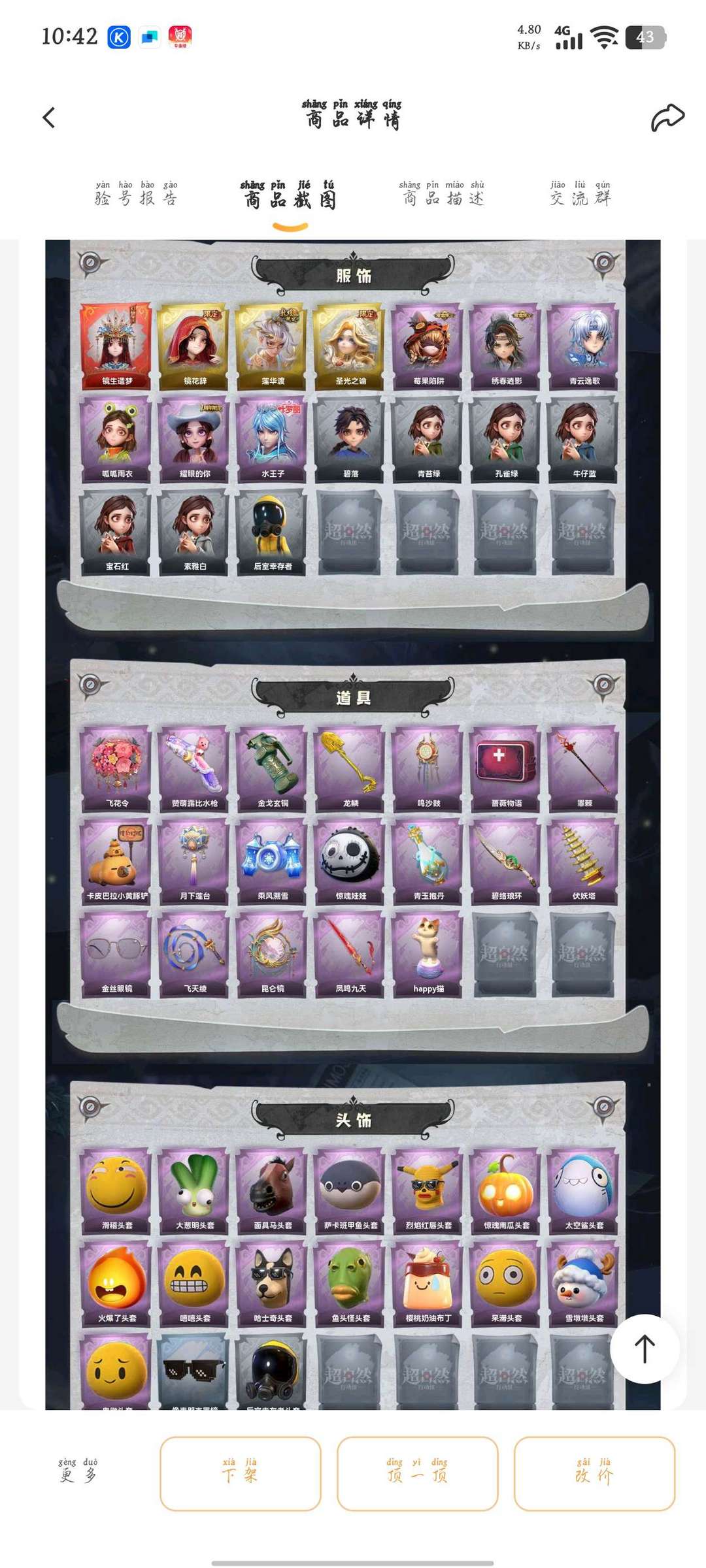 装备描述:红皮1;金皮3;紫皮6;道具皮19;皮肤:巫铃儿-镜生遗梦,巫铃儿-镜花辞,逍遥-莲华渡,薇薇安-圣光之谕,莉莉-莓果陷阱,逍遥-绣春逍影,零-青云逸歌,小黄-呱呱雨衣,爱丽丝-耀眼的你,艾伦-水王子